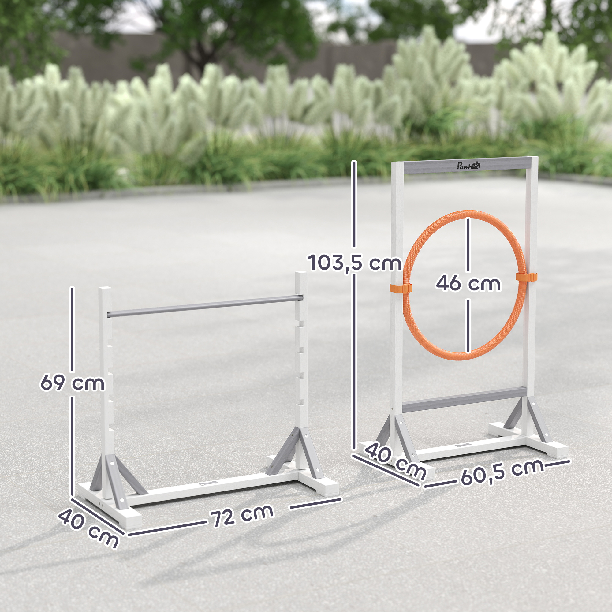Steigern Sie Spiel und Fitness mit dem PawHut Agility-Set für Hunde! Im vier-teiligen Kit sind drei verstellbare Sprunghürden und ein Reifen - perfekt, um die Beweglichkeit Ihres Vierbeiners zu fördern und die Beziehung zu vertiefen, Gefertigt aus sicherem, langlebigem Fichtenholz und Kunststoff, ideales Agility-Set für den Einsatz drinnen wie draußen auf flachen Oberflächen, Sicher und einsatzbereit!