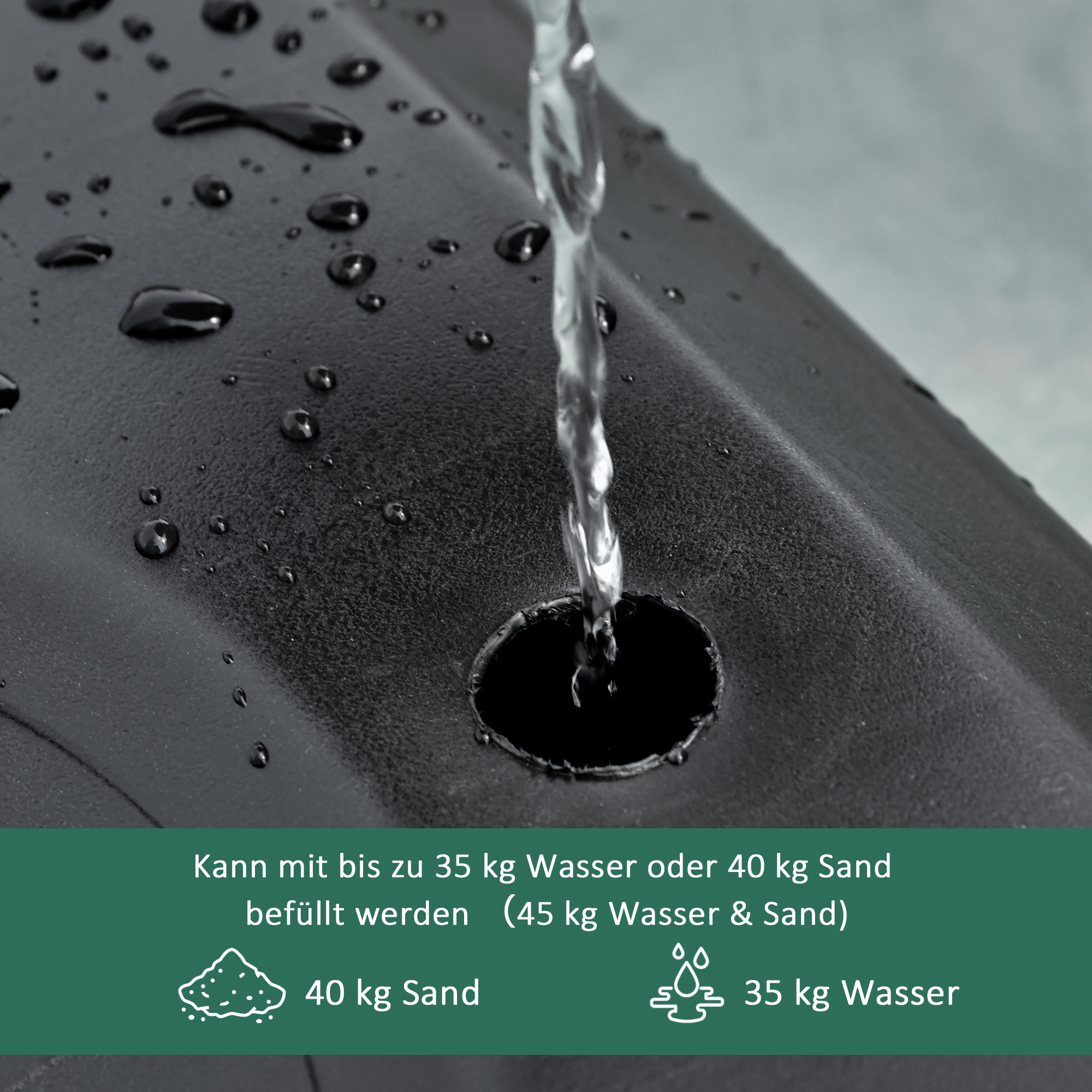 - - Der Boden kann mit 35 kg Wasser, 40 kg oder maximal 45 kg Wasser und Sand für eine bessere Stabilität befüllt werden