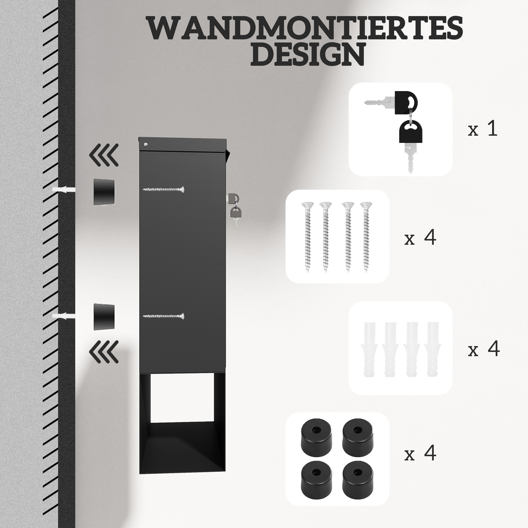 - Einfache Installation: Mit allen erforderlichen Schrauben, Bolzen und Gummi-Keilen ausgestattet, lässt sich der Briefkasten schnell und mühelos nahe Ihrem Tor oder Ihrer Tür anbringen,