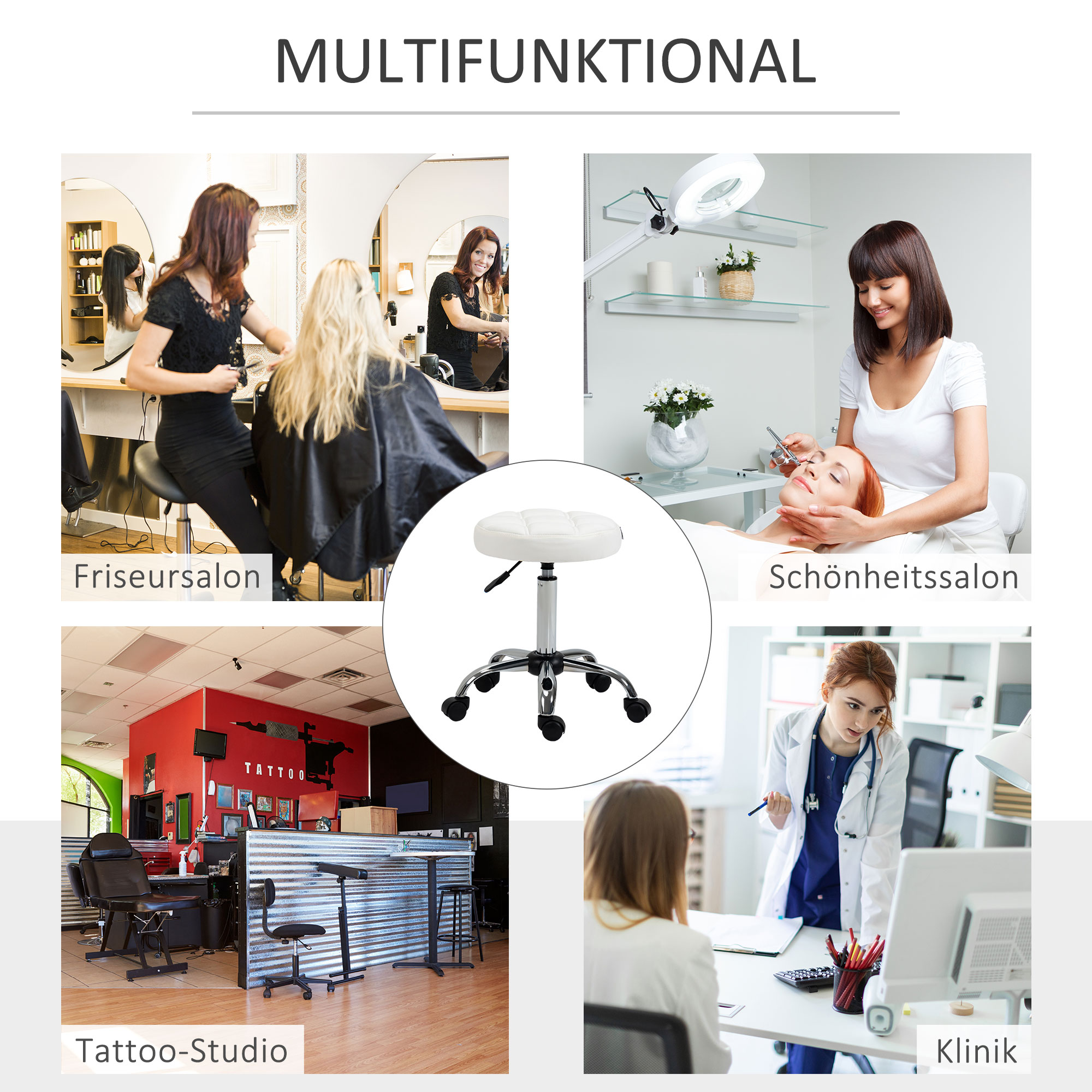 Sind Sie auf der Suche nach einem praktischen, platzsparenden und bequemen Rollhocker? Dieser höhenverstellbare Salonhocker von HOMCOM ist ideal in jeder Hinsicht, Dank seines armlosen, drehbaren Designs genießten Sie uneingeschränkte Bewegungsfreiheit, Wenn nicht gebraucht, lässt er sich einfach unter einem Tisch verbergen, ohne Platz zu beanspruchen, Der voll gepolsterte Sitz, bezogen mit Kunstleder, bietet höchsten Komfort und das elegante Steppmuster verleiht ihm eine ansprechende Optik,