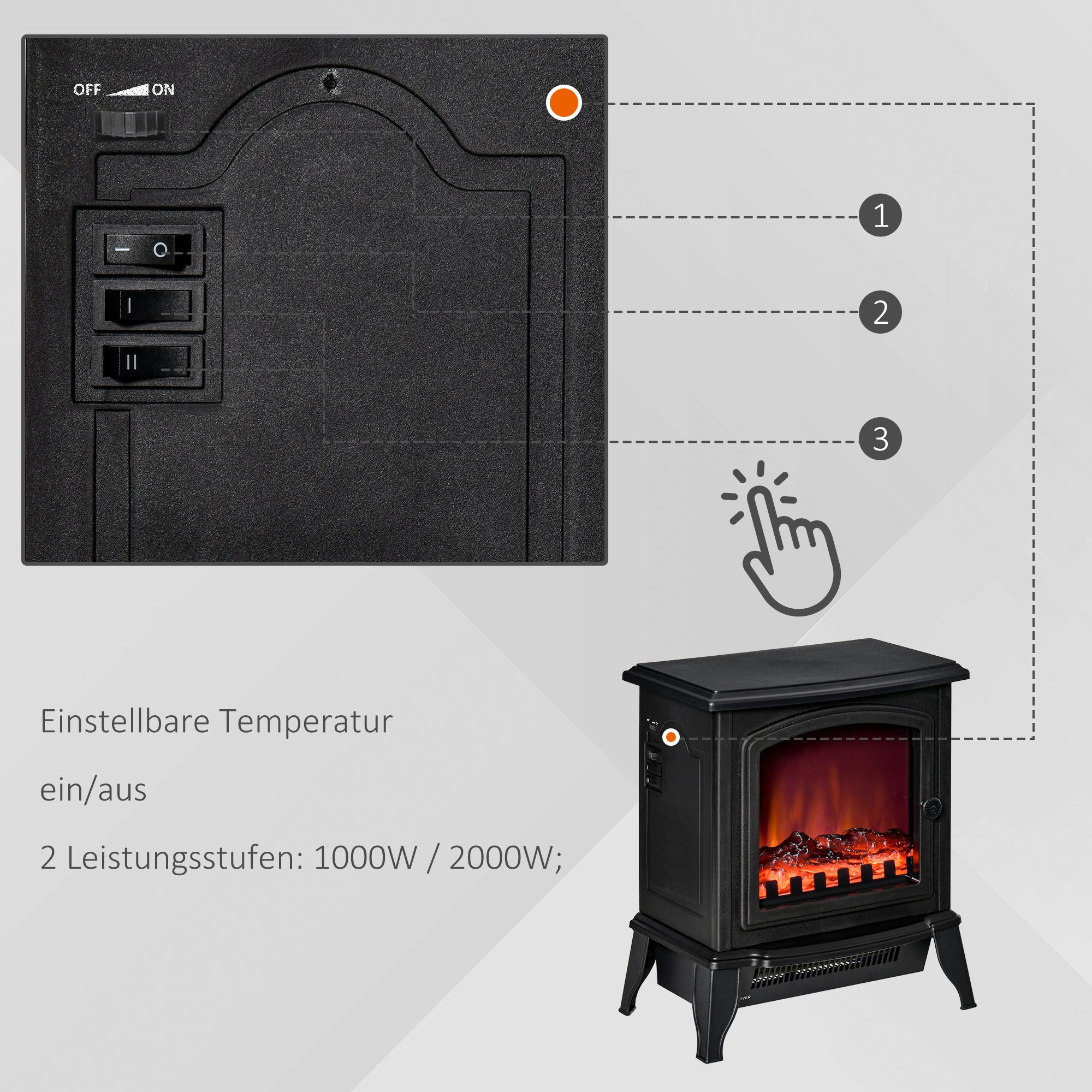 Elektrokamin freistehend, Flammeneffekt, 2 Heizmodi 1000W/2000W, gehärtetes Glas, Schwarz, 36,5x24x45,5 cm