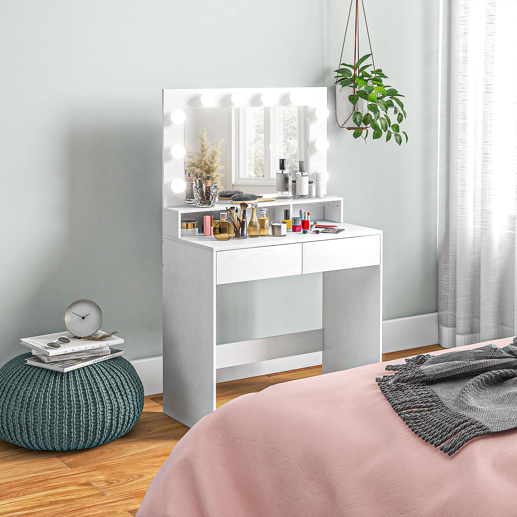 Frisiertisch mit beleuchtetem Spiegel, Schubladen, 3 Lichtoptionen, 10 Glühbirnen, moderner Schminktisch in Weiß