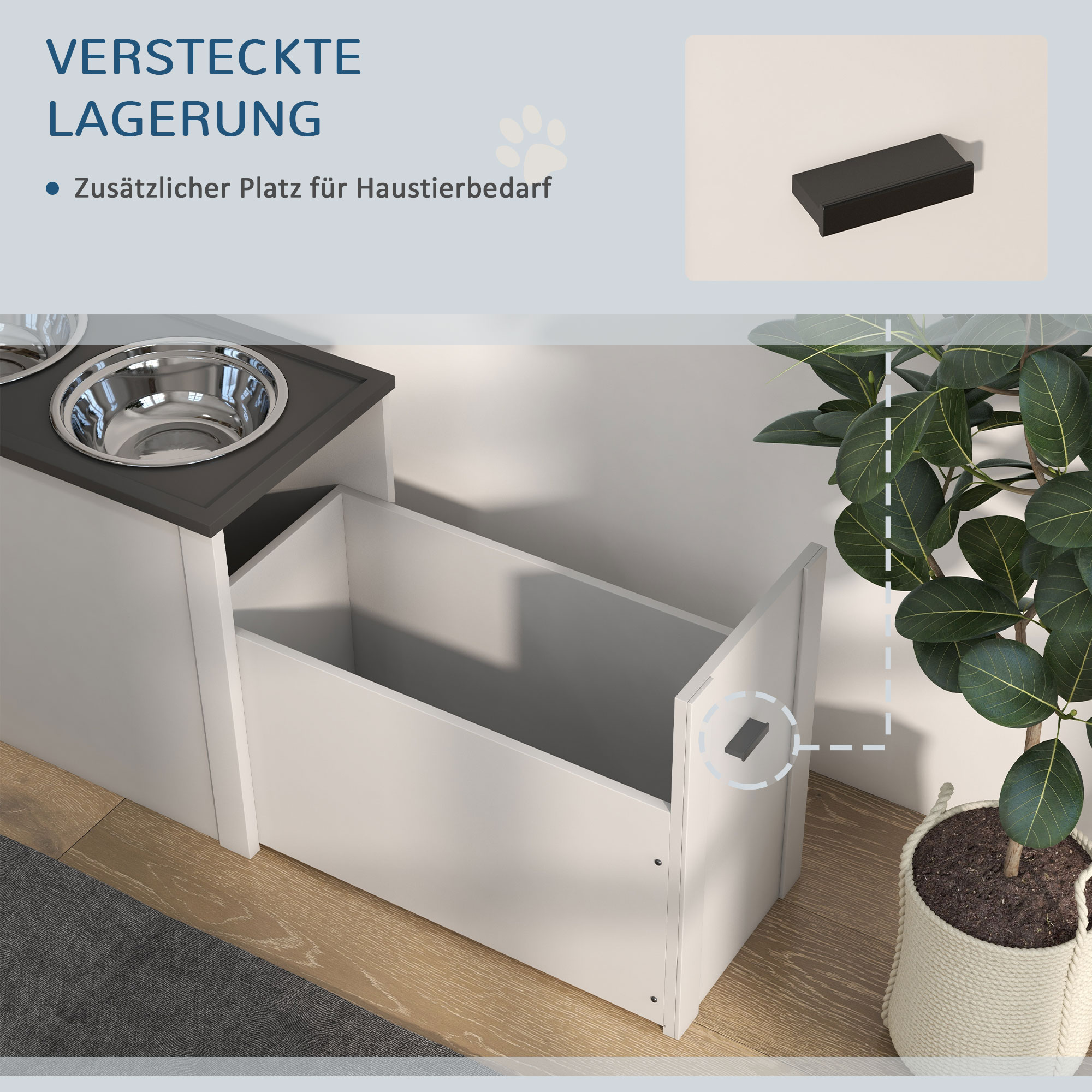 Futterstation erhöhte Fressnäpfe 1 Stauraum 2 Edelstahl-Futternäpfe, 60 x 30 x 42cm, Weiß + Grau