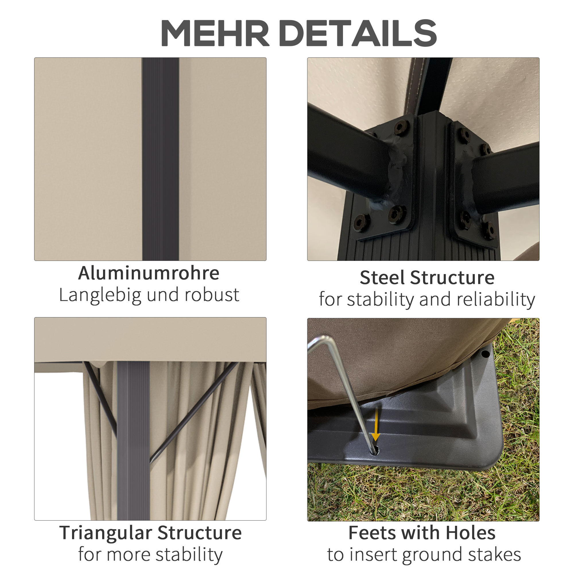 Dieser 3 x 3 m große Pavillon von Outsunny ist eine hervorragende Möglichkeit, Ihren Außenbereich elegant aufzuwerten, Sie können Ihre Freunde und Familienmitglieder empfangen, um eine Party zu veranstalten, oder sich einfach nur entspannen und die Unterhaltungen genießen, Genießen Sie Komfort in der Sonne: Schaffen Sie sich mit unserem Patio-Pavillon Ihre eigene, persönliche Oase,