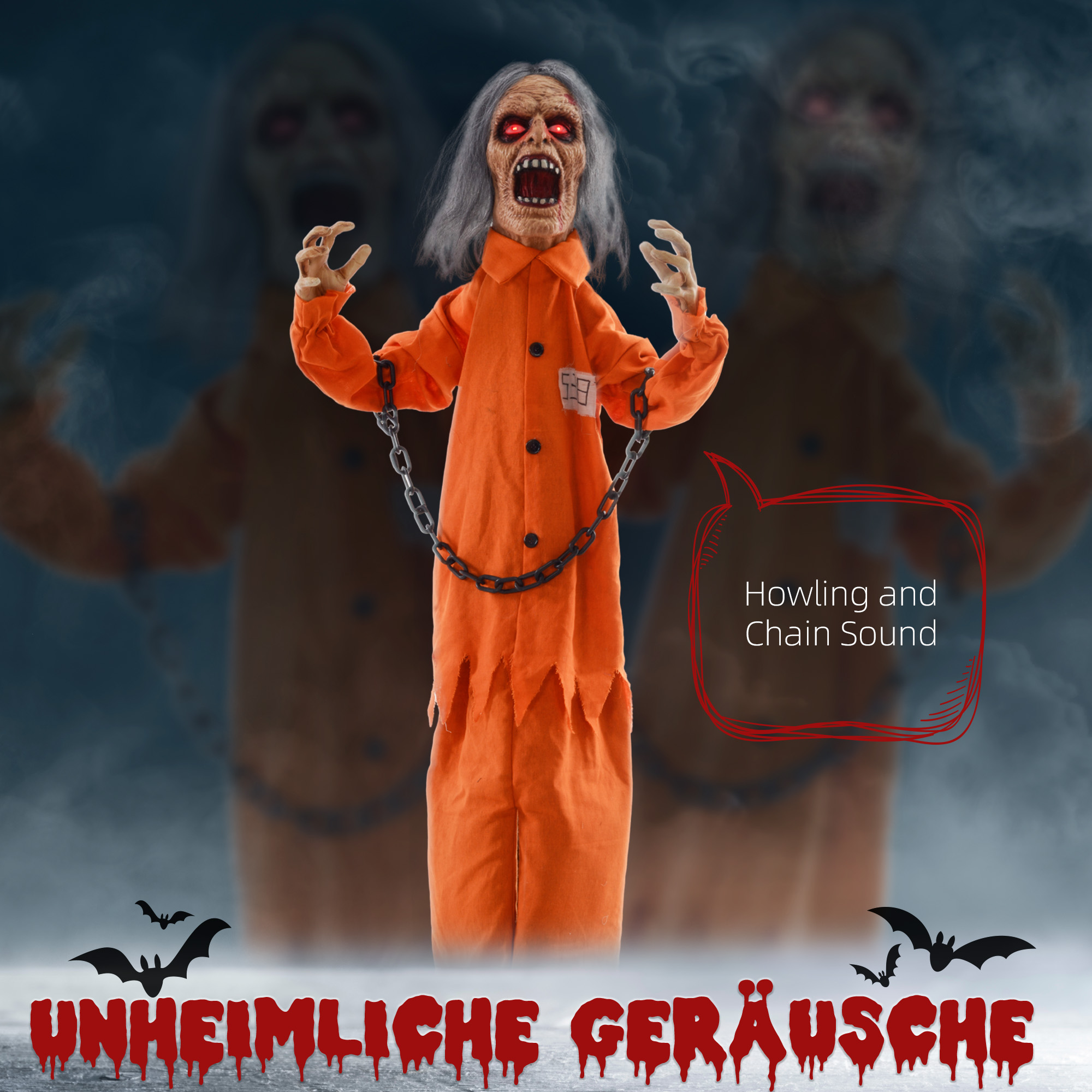 Entfesseln Sie mit dem HOMCOM Animierten Halloween Dekoration gruselige Schauer, Diese Figur eines gefesselten Gefangenen mit biegsamen Armen wird durch Berührungen oder laute Schreie aktiviert, Die Halloween Dekoration Figur dreht den Kopf, bewegt die Hände, zeigt unheimlich rot leuchtende Augen und erzeugt ein gruseliges Heulen sowie Kettenrasseln, ideal für jede Halloween Dekoration im Freien,