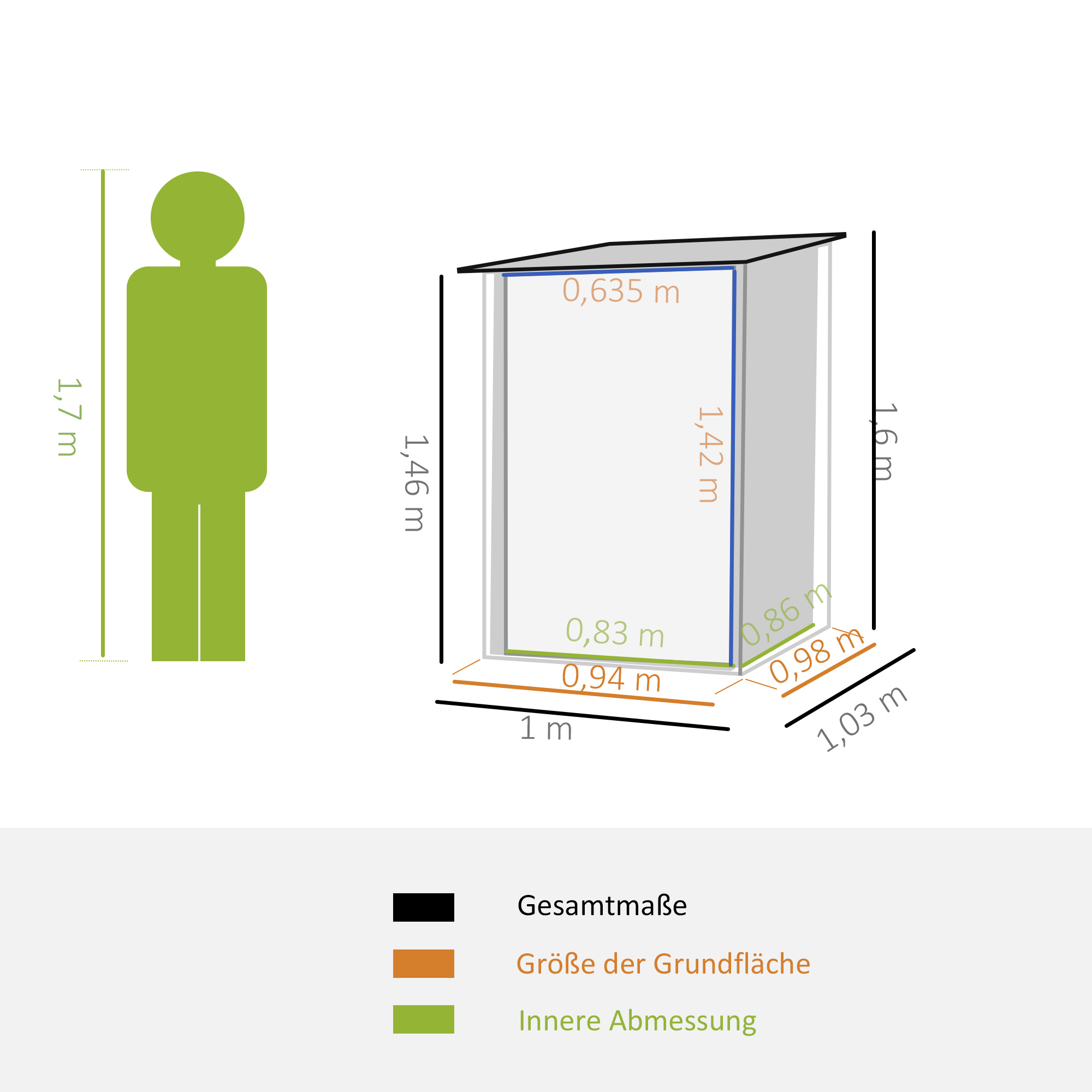 - Schaffen Sie eine paradiesische Ordnung in Ihrem Garten mithilfe dieses großen Geräteschuppens von Outsunny! Trotz seiner kompakten Konstruktion bietet er reichlich Raum für unterschiedlichste Geräte und Werkzeuge, Aus stabilem Stahl gebaut und mit einem wetterfesten Anstrich versehen, wird Ihnen dieser Gartenschrank eine lange Zeit zuverlässig dienen, Das geneigte Dach lässt Regenwasser ungehindert abfließen und die verriegelbare Tür verhindert, dass Tiere eindringen,