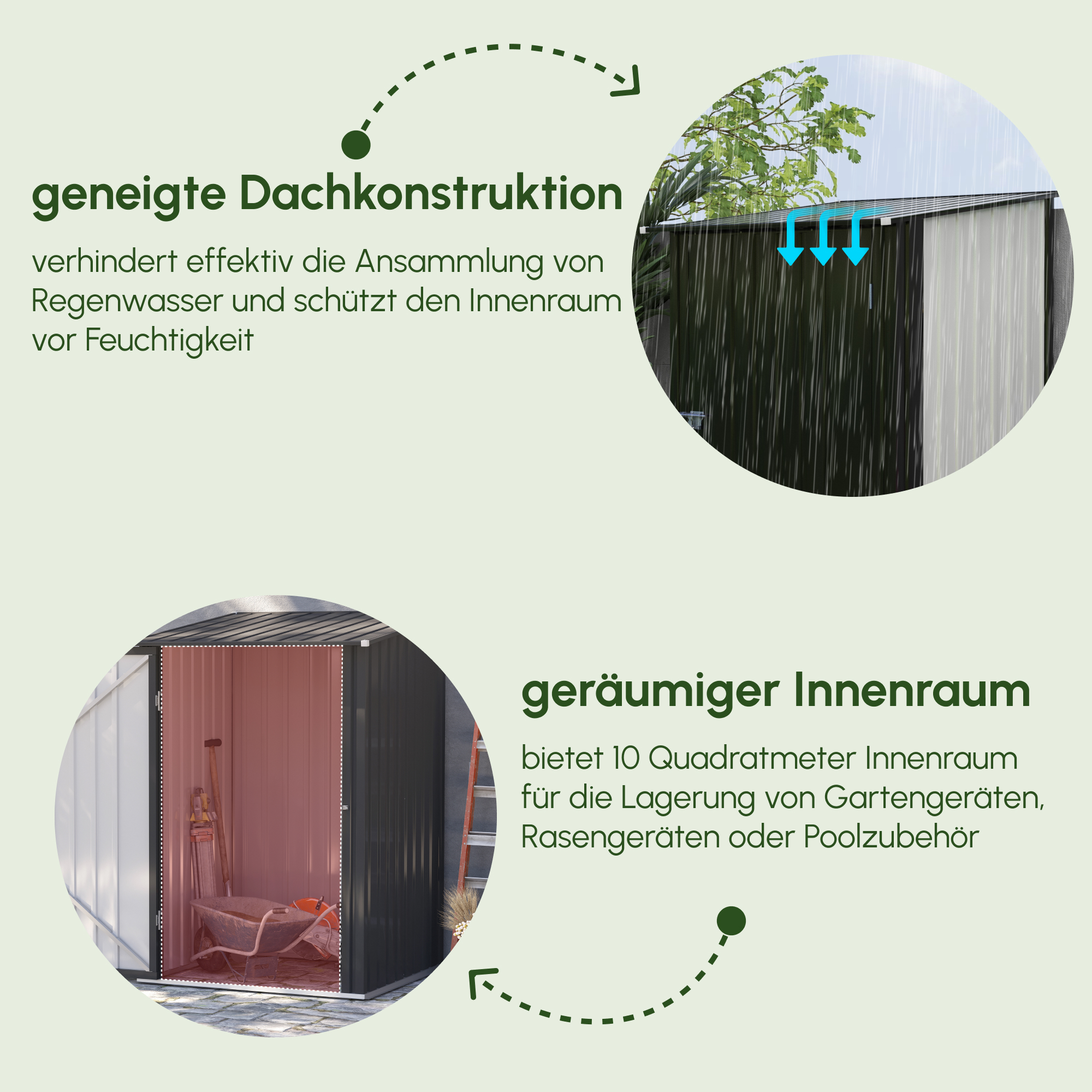 - Geneigtes Dach: Dank der praktischen Dachneigung kann Regenwasser ungehindert abfließen, sodass Ihr Gartenwerkzeug sicher vor Rost geschützt wird,