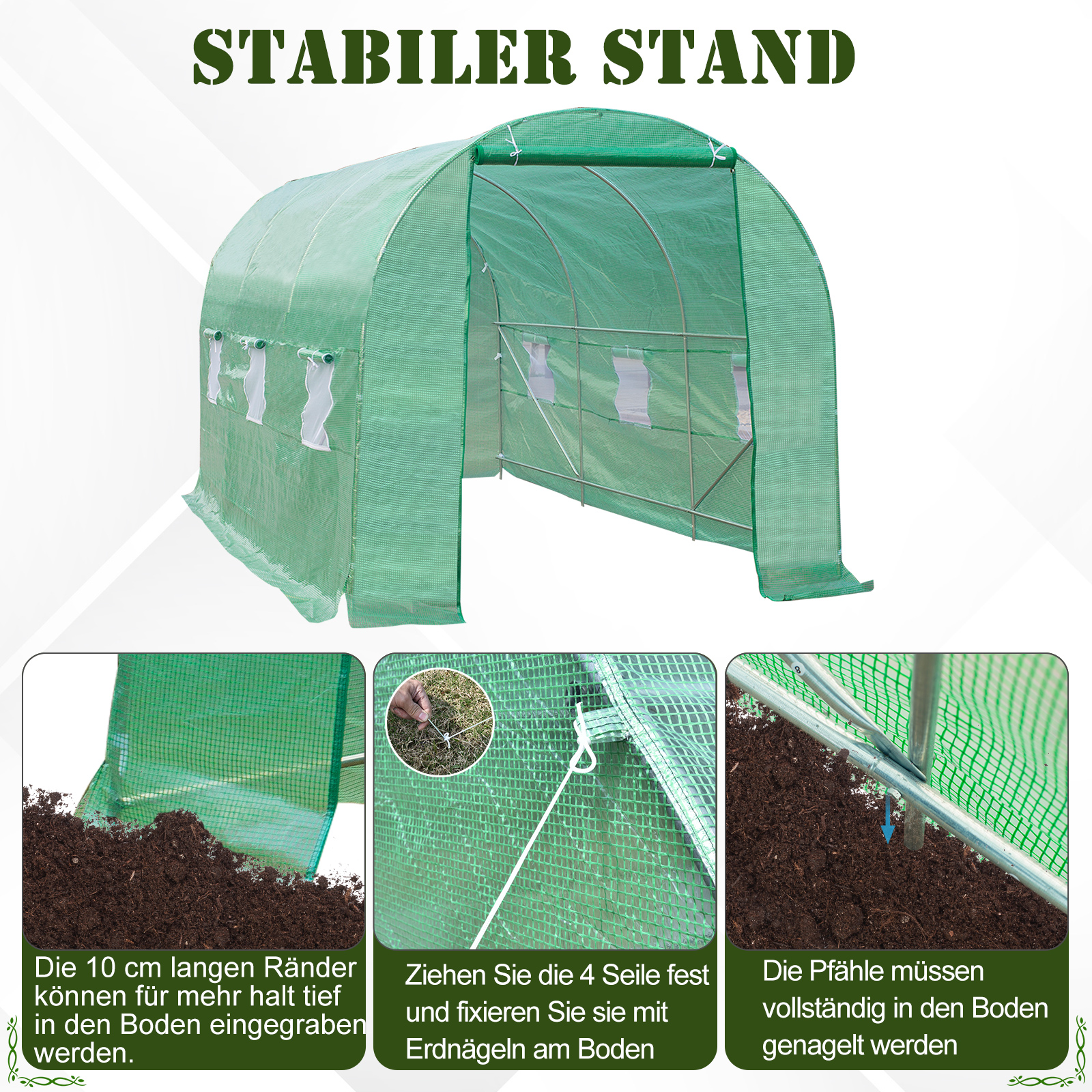 Gewächshaus 445x190x200cm Foliengewächshaus Tomatenhaus Tür mit Moskitonetz, Fenster, Folientunnel aus verzinktem Stahl, stabiles Pflanztunnel, Treibhaus inkl. Erdanker Seilen, Grün