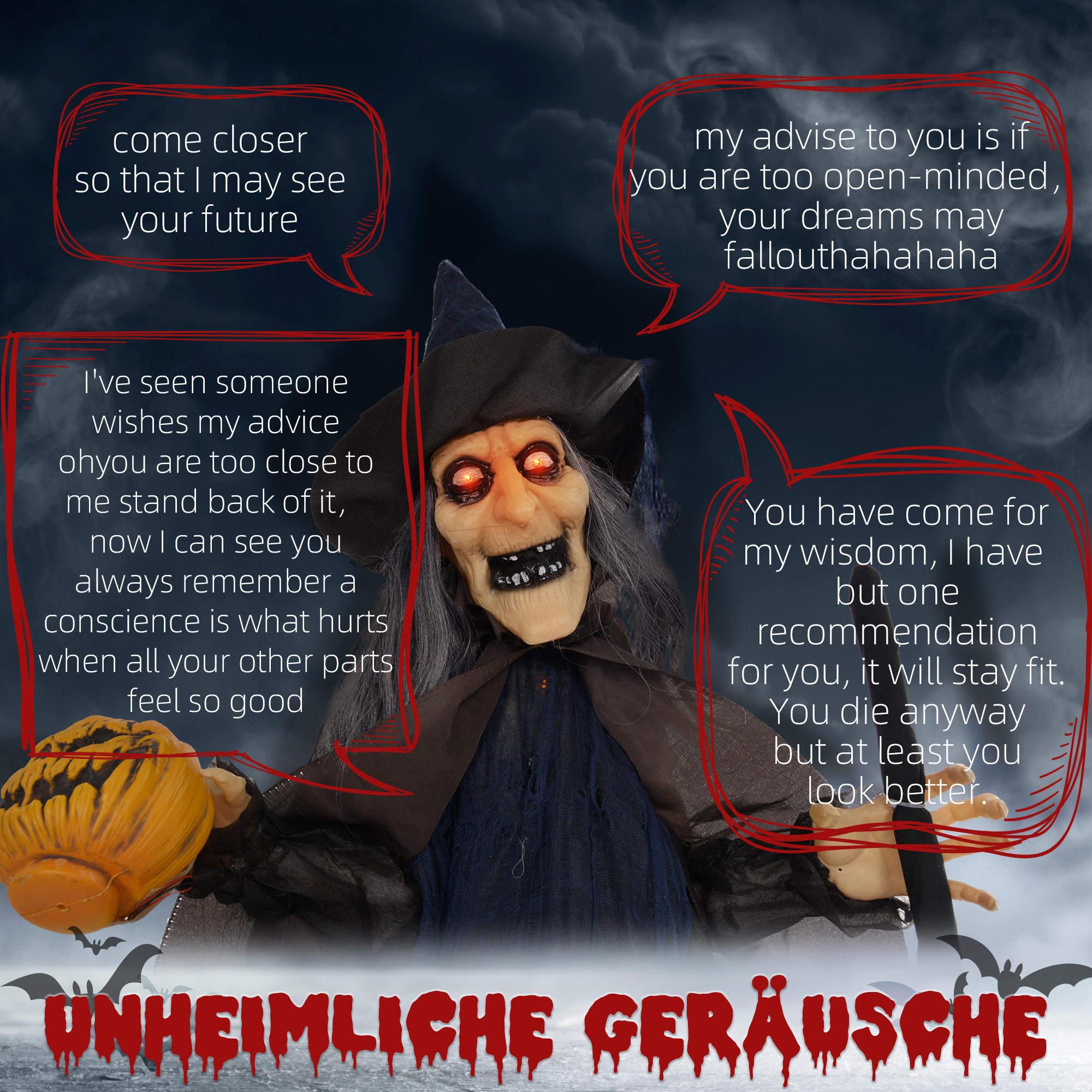 - Produktdaten der Halloween Dekoration: Gesamtmaße: 107L x 65B x 190H cm, Der Zusammenbau ist einfach, Hinweis: Die Hexe spricht Englisch,