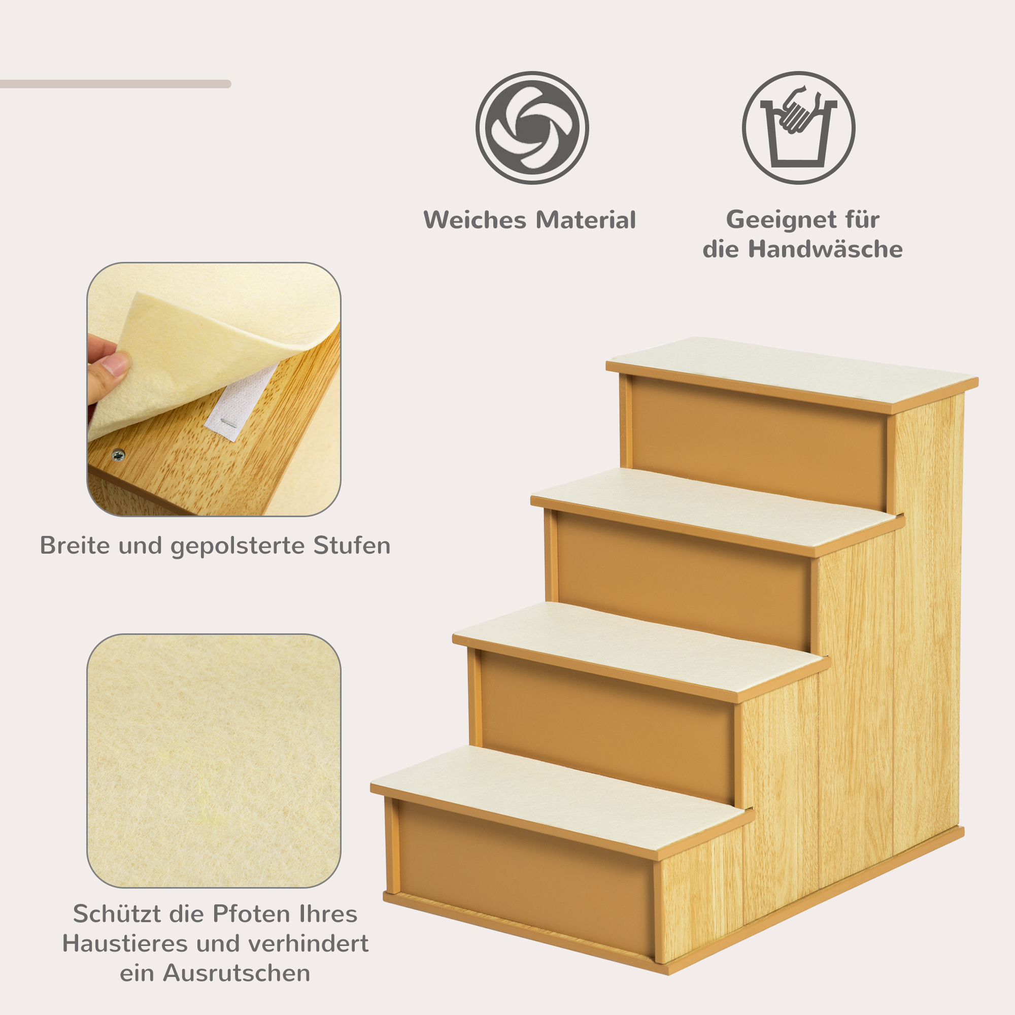 - Einfache Pflege: Die vier abnehmbaren Teppiche sind handwaschbar und lassen sich mühelos reinigen, Auch die Treppe selbst kann einfach mit einem feuchten Tuch gesäubert werden