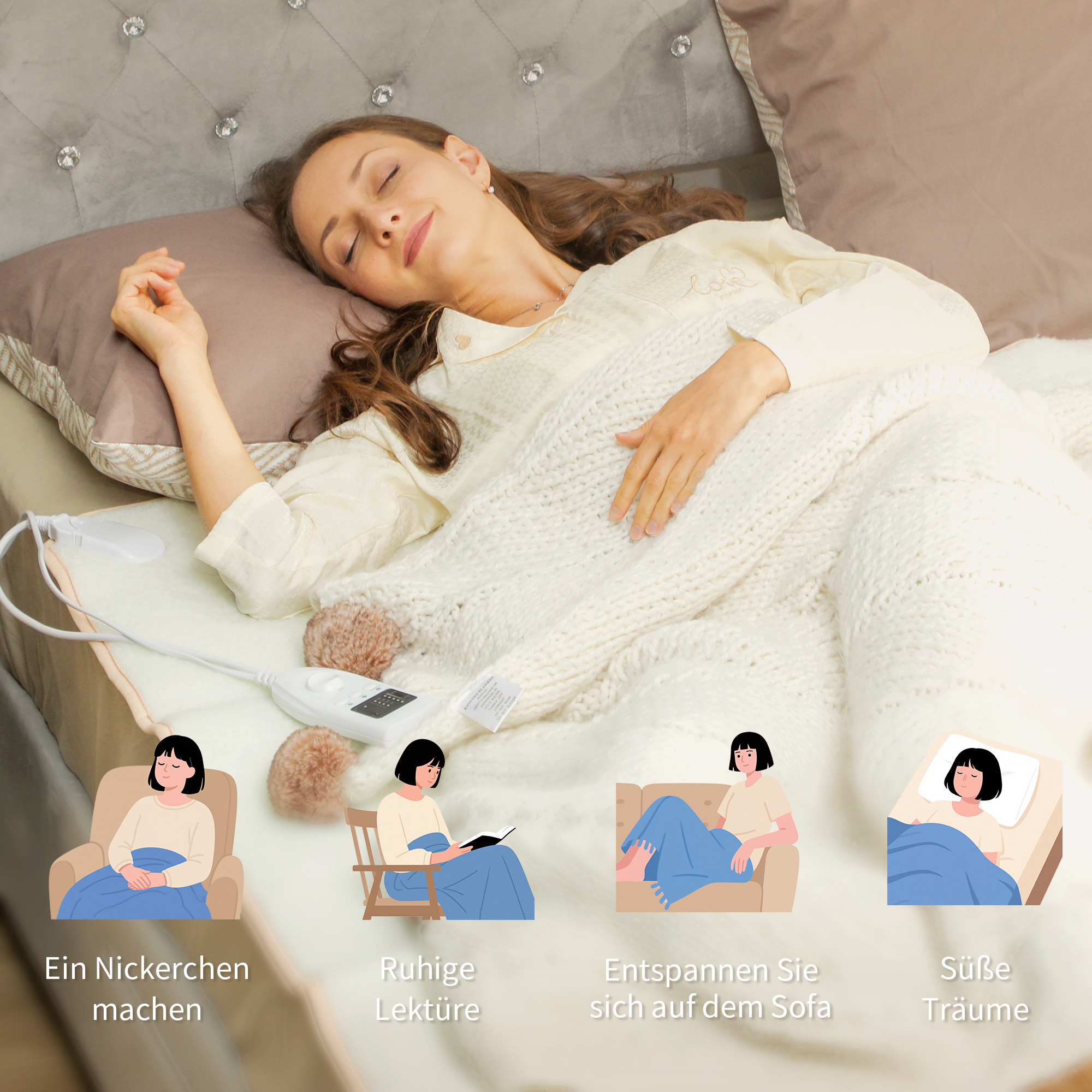 - Personalisierte Wärme: Passen Sie die Temperatur mühelos mit fünf Heizstufen zwischen 30°C und 55°C an, um genau das richtige Maß an Wärme zu finden. Ein Timer der Wärmedecke von 1 bis 10 Stunden mit automatischer Abschaltung ermöglicht eine maßgeschneiderte, sichere und bequeme Handhabung.