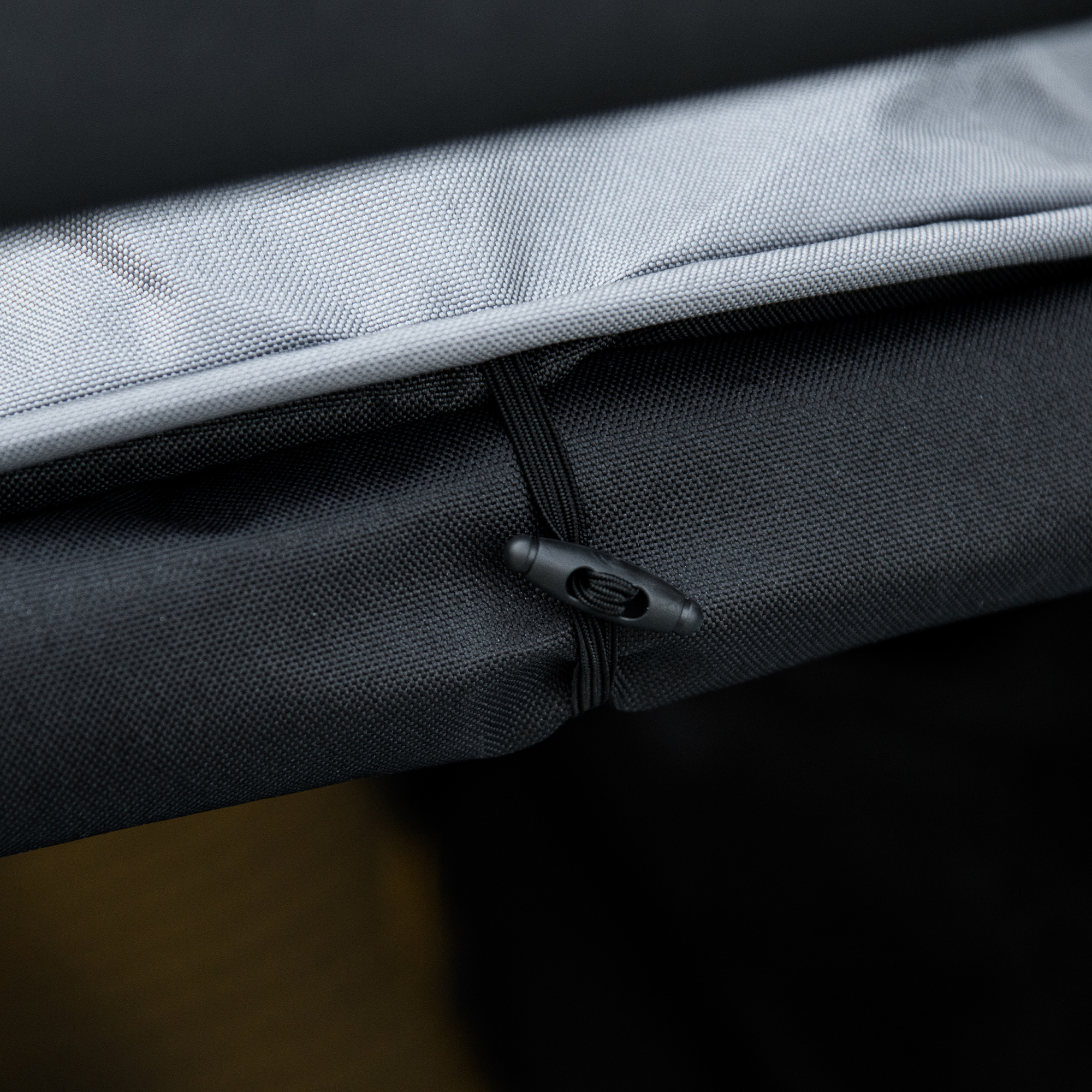 - - Ein in drei Positionen verstellbares Verdeck, Türen mit Reißverschluss und ein Netzfenster