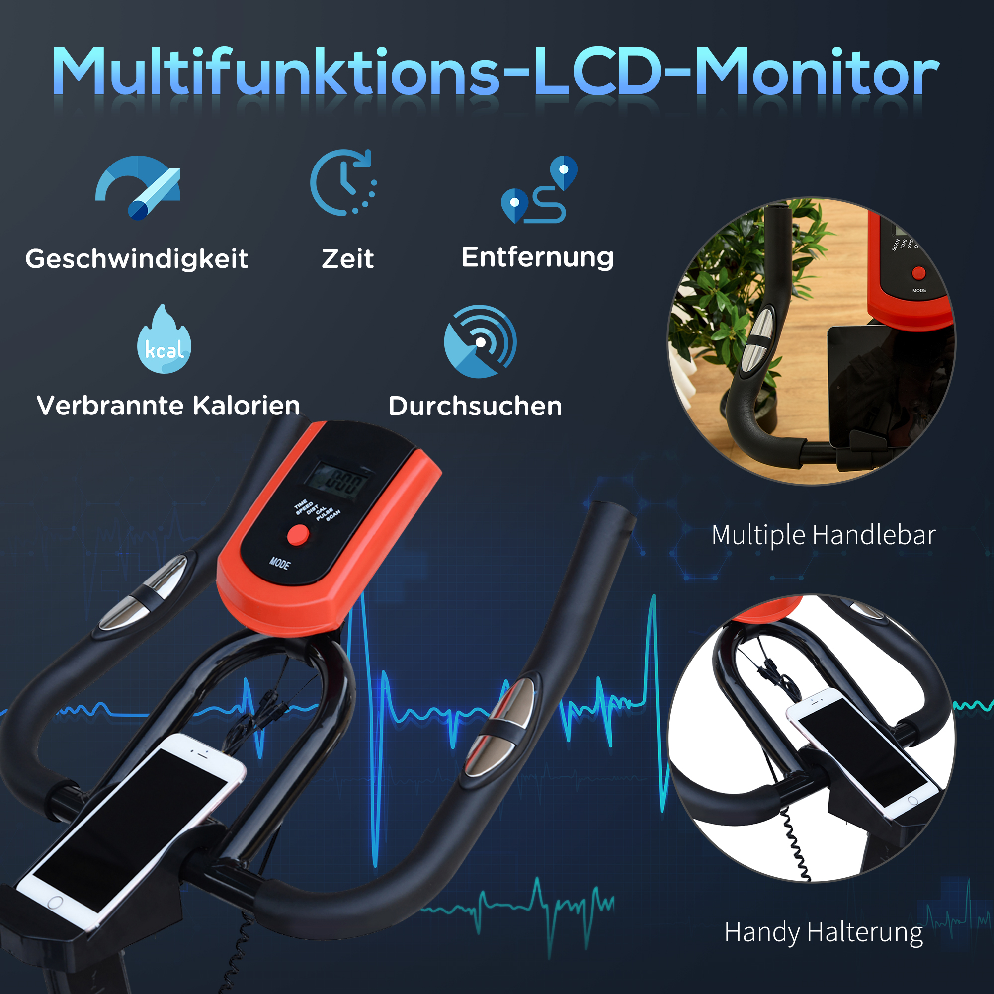 - - LCD-Display zeigt Trainingsdaten wie Zeit, Geschwindigkeit, Distanz und Kalorienverbrauch