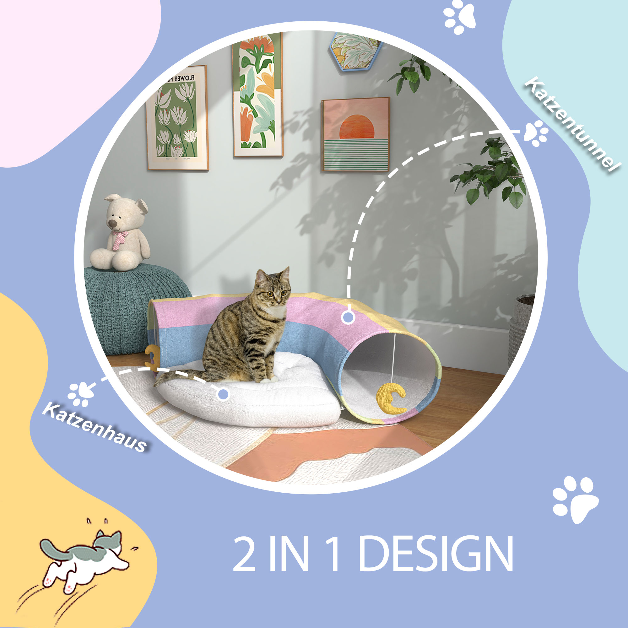 Katzentunnel Katzenspielzeug, 2 Spielzeuge, 1 Liegepolster, verspieltes Design, 105 cm x 65 cm x 28 cm, Mehrfarbig