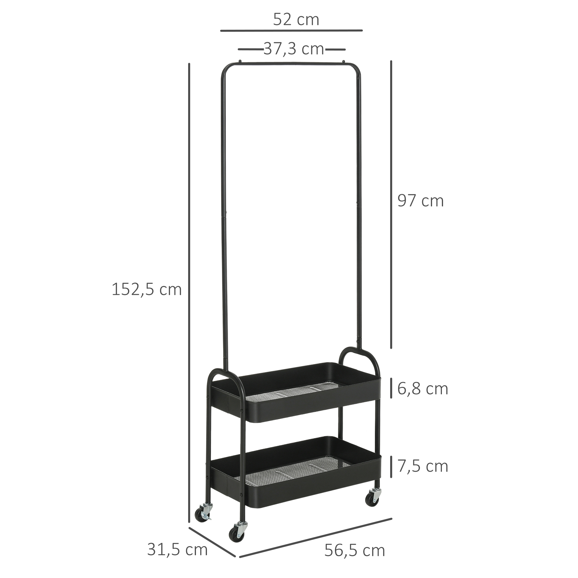 Dieser mobile Kleiderständer mit Ablage von HOMCOM optimiert die Platznutzung, Seine kompakte Größe ist ideal für begrenzten Räume wie Flure oder Garderoben geeignet, Der robuste Rahmen aus pulverbeschichtetem Stahl der Flurgarderobe trägt zuverlässig Mäntel, Jacken und weitere Kleidungsstücke, Zwei untere Ablagen der Standgarderobe bieten Stauraum für Schuhe und Taschen, Dank vier leichtgängiger Rollen ist er zudem mühelos verschiebbar,