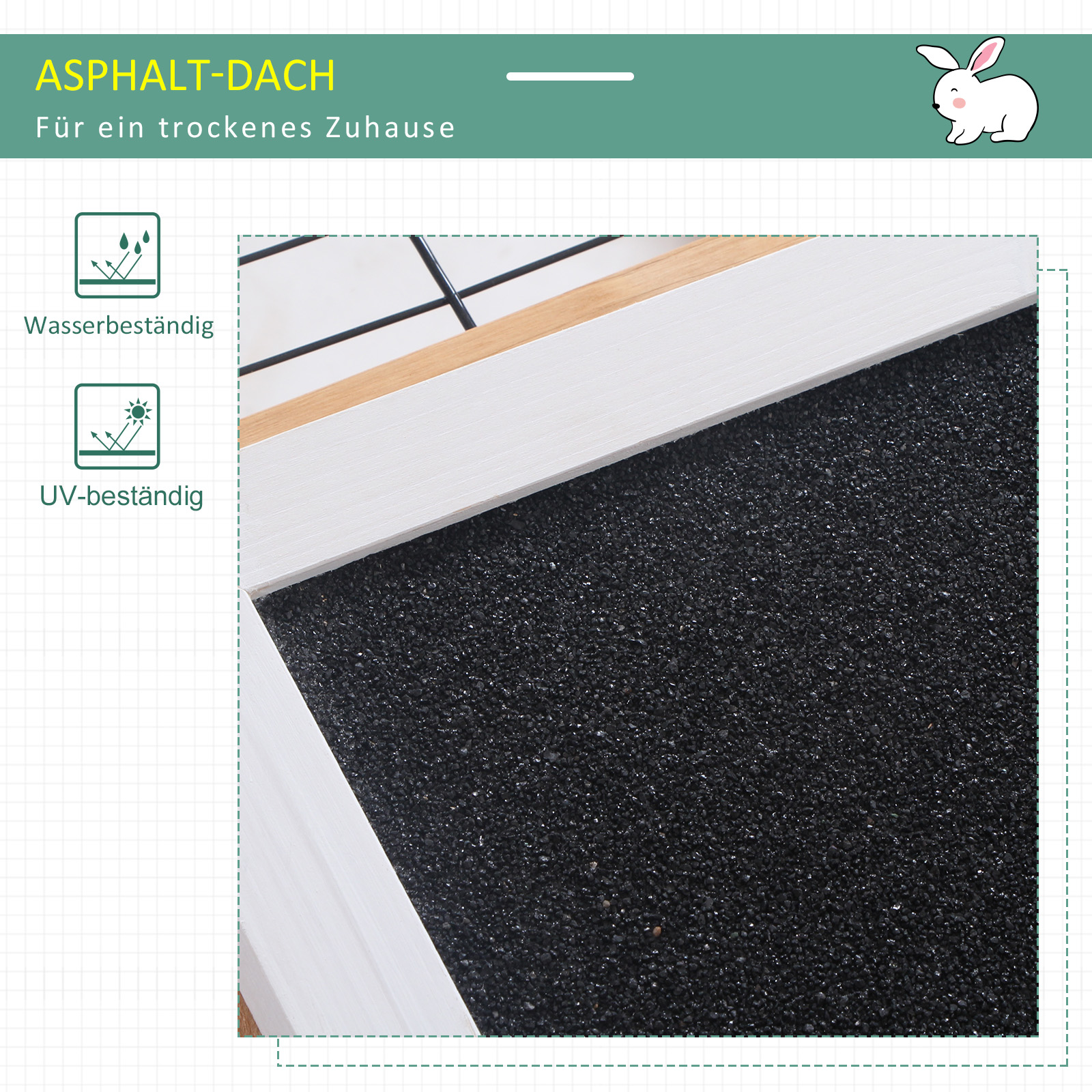 - Wetterfest: Der Stallrahmen besteht aus langlebigen, wetterbeständigen Holz und das Häuschen ist mit einem wasserdichten Asphaltdach versehen, sodass Ihr Kaninchen bei Wind und Wetter geschützt ist,