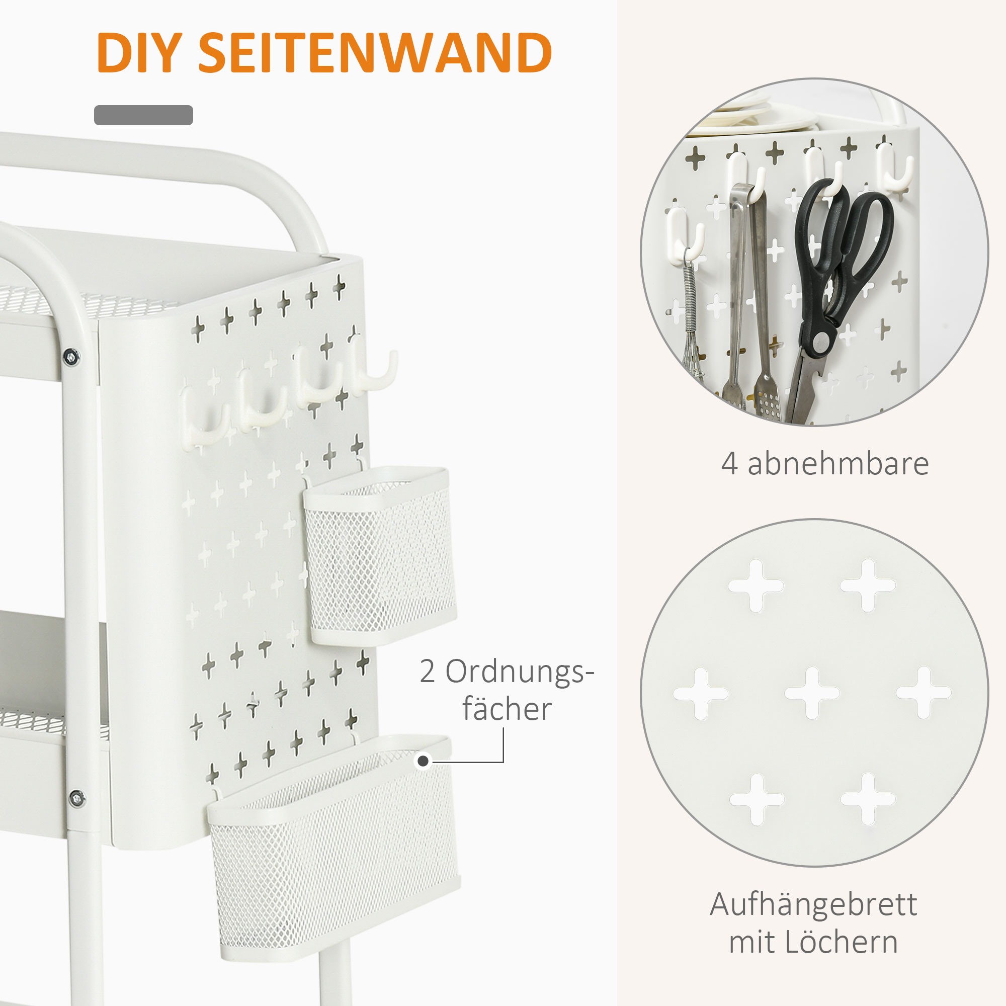 Küchentrolley mit Lochtafel, Handtuchhaltern und Aufbewahrungskörben, 51,5 cm x 32 cm x75,6 cm, Weiß