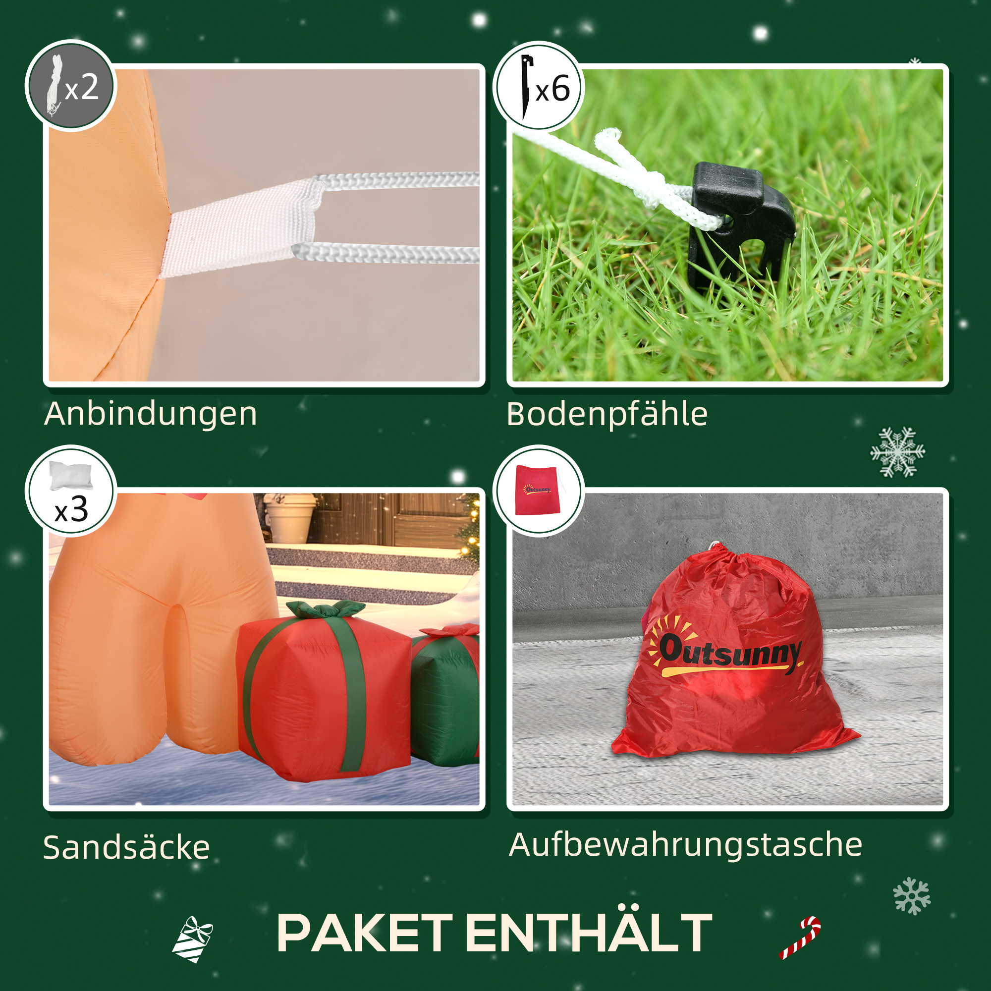 - Zubehör enthalten: Mit sechs Erdspießen, zwei Abspannleinen und drei Sandsäcken ausgestattet, steht diese Weihnachtsdekoration auch bei Wind sicher und fest