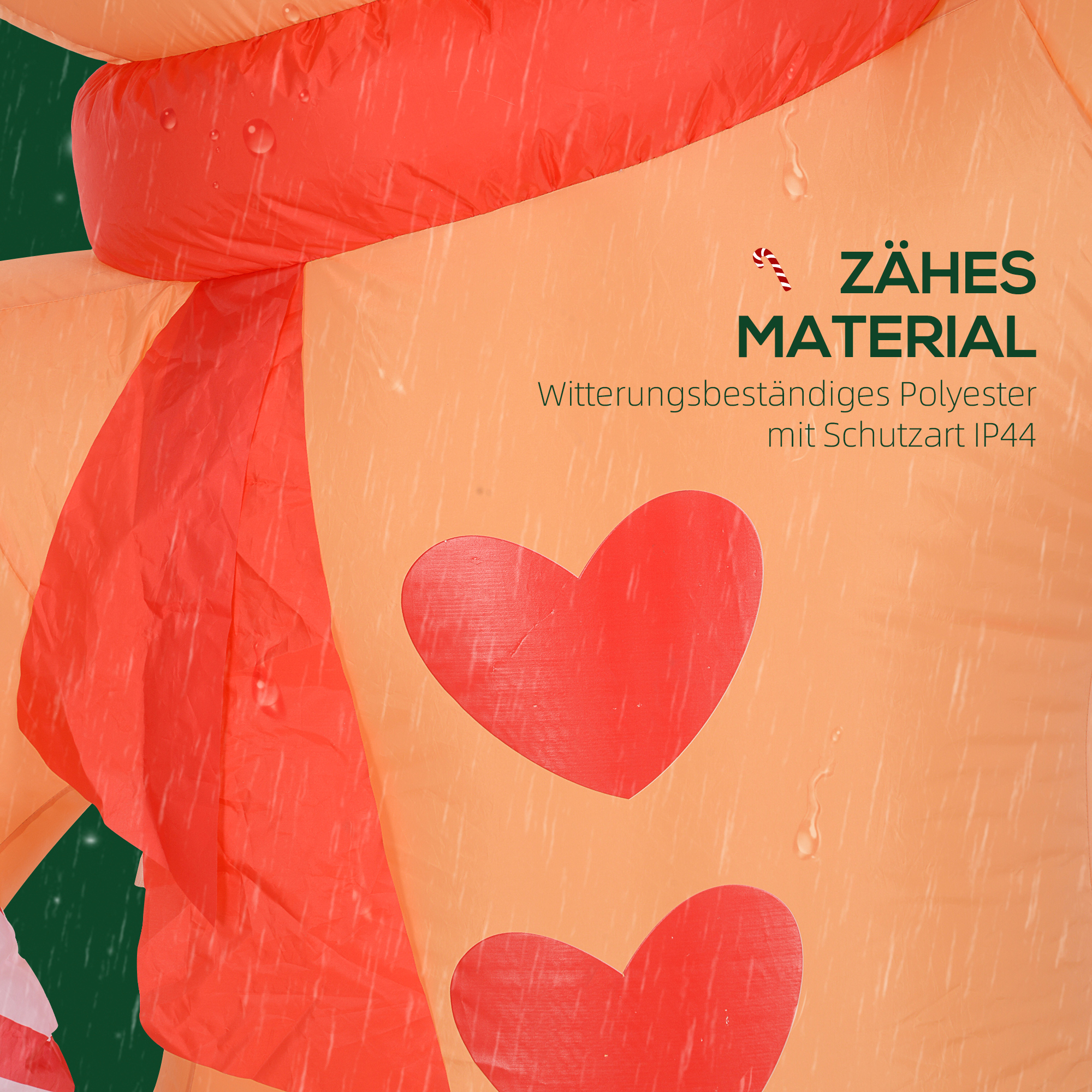 - Wasserabweisender Polyester: Hochwertiger Stoff, form- und farbbeständig. Dank der IP44-Zertifizierung ist diese aufblasbare Weihnachtsdekoration auch für Außenbereiche geeignet