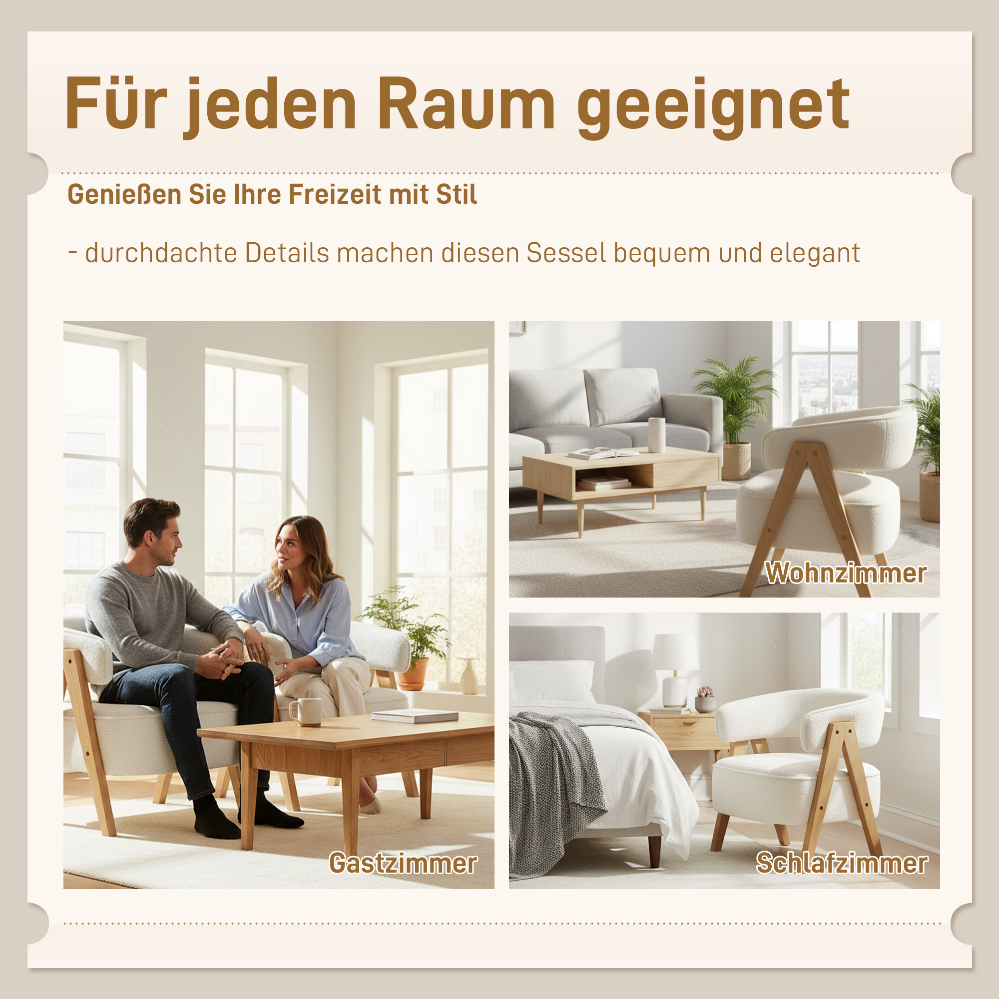 Moderner Polstersessel, Fleece-Bezug, Akzentstuhl, Armlehnstuhl mit Holzbeinen, Metallrahmen, Weiß
