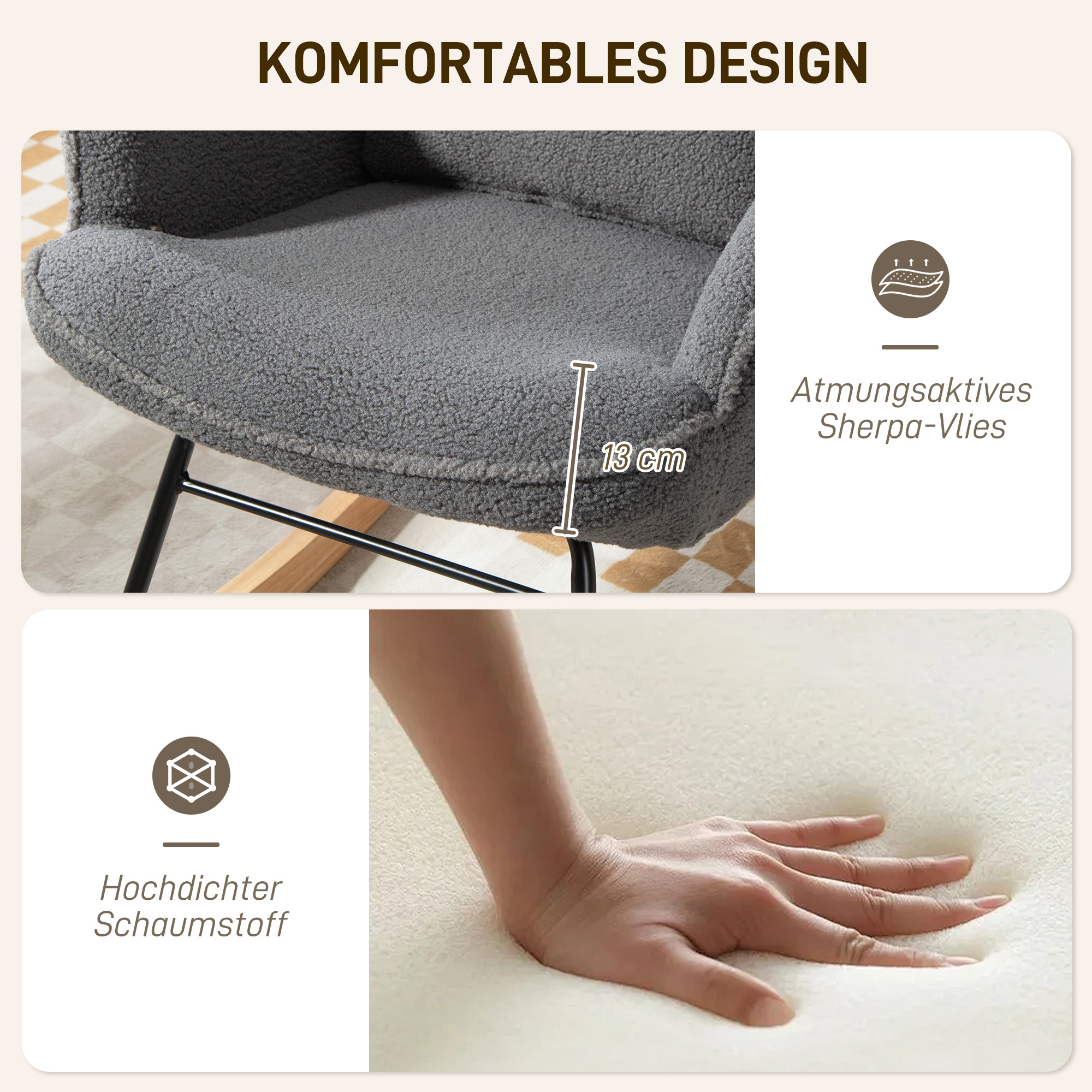 Genießen Sie den HOMCOM Schaukelstuhl, eine perfekte Symbiose aus Stil und Bequemlichkeit, Er ermöglicht sanftes Schaukeln zwischen 95-115°, abgefedert durch Filzpolster zum Schutz Ihrer Böden, Der Schaukelsessel, gestaltet ergonomisch, mit weichem Kopf- und Fußteil aus atmungsaktivem Fleece, getragen von einem robusten Stahlrahmen und schicken Buchenholzbeinen, ideal für entspannte Momente,