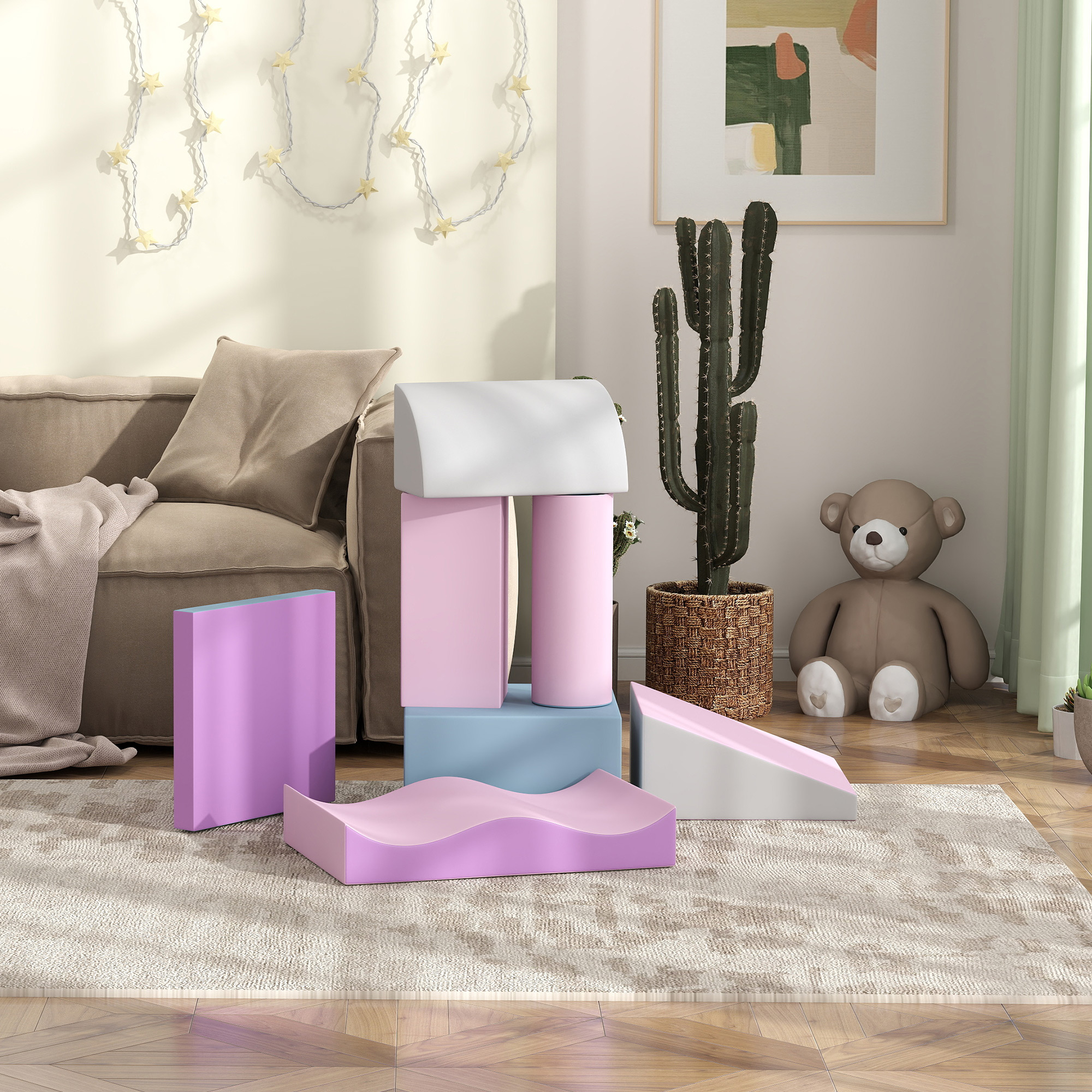 - Weiche Schaumstoffbausteine: Mit drei Quadern, einer Rampe, einem Wellen-Element, einem Zylinder und einem Viertelzylinder können Kinder sicher laufen, springen und krabbeln, Ideal für aktive und sichere Spielstunden,