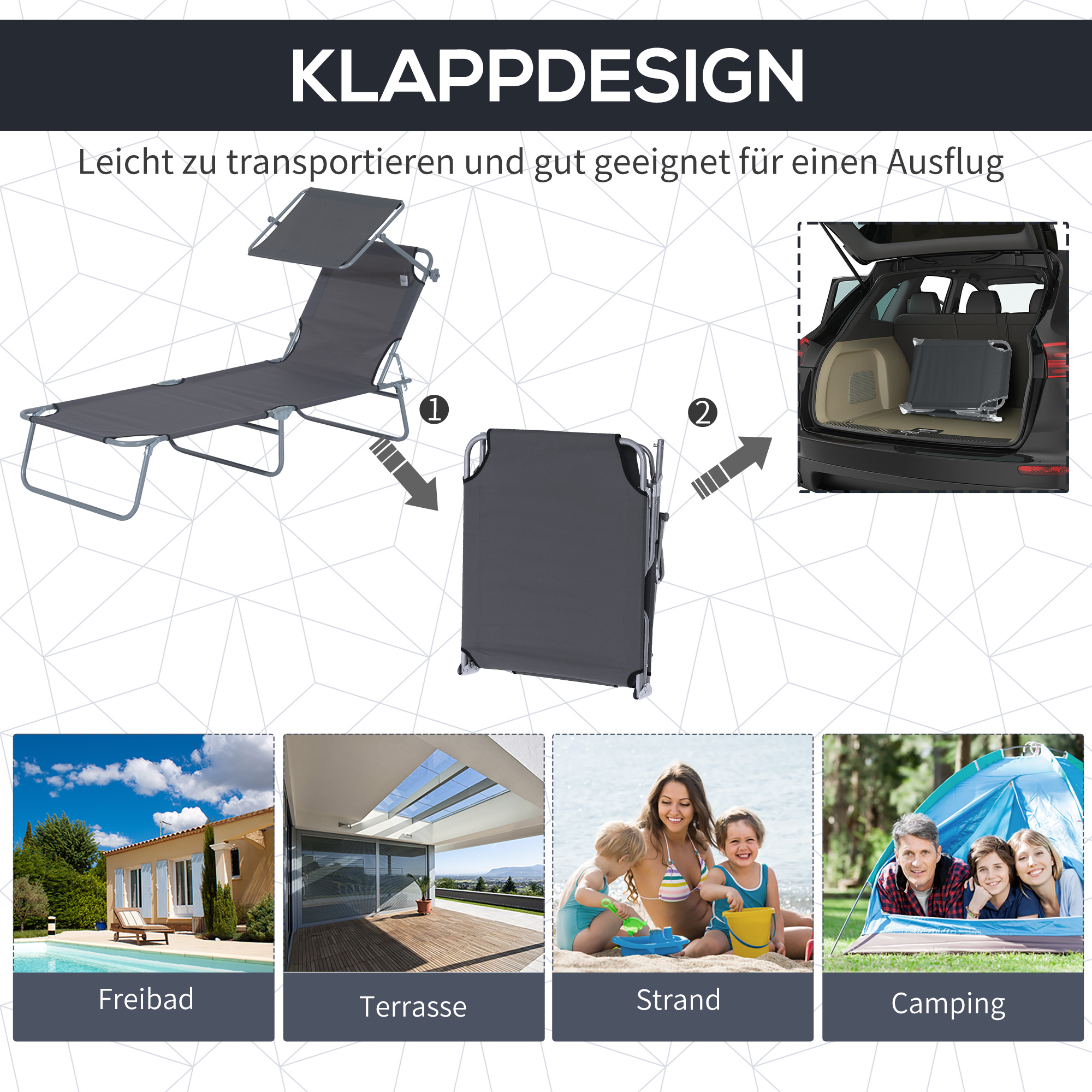 Sonnenliege klappbar Gartenliege mit Sonnenschutz Wellnessliege mit 4-Fach verstellbare Rückenlehne Strandliege bis 120kg belastbar für Garten, Balkon und Pool geeignet, 6 Farben(Grau )