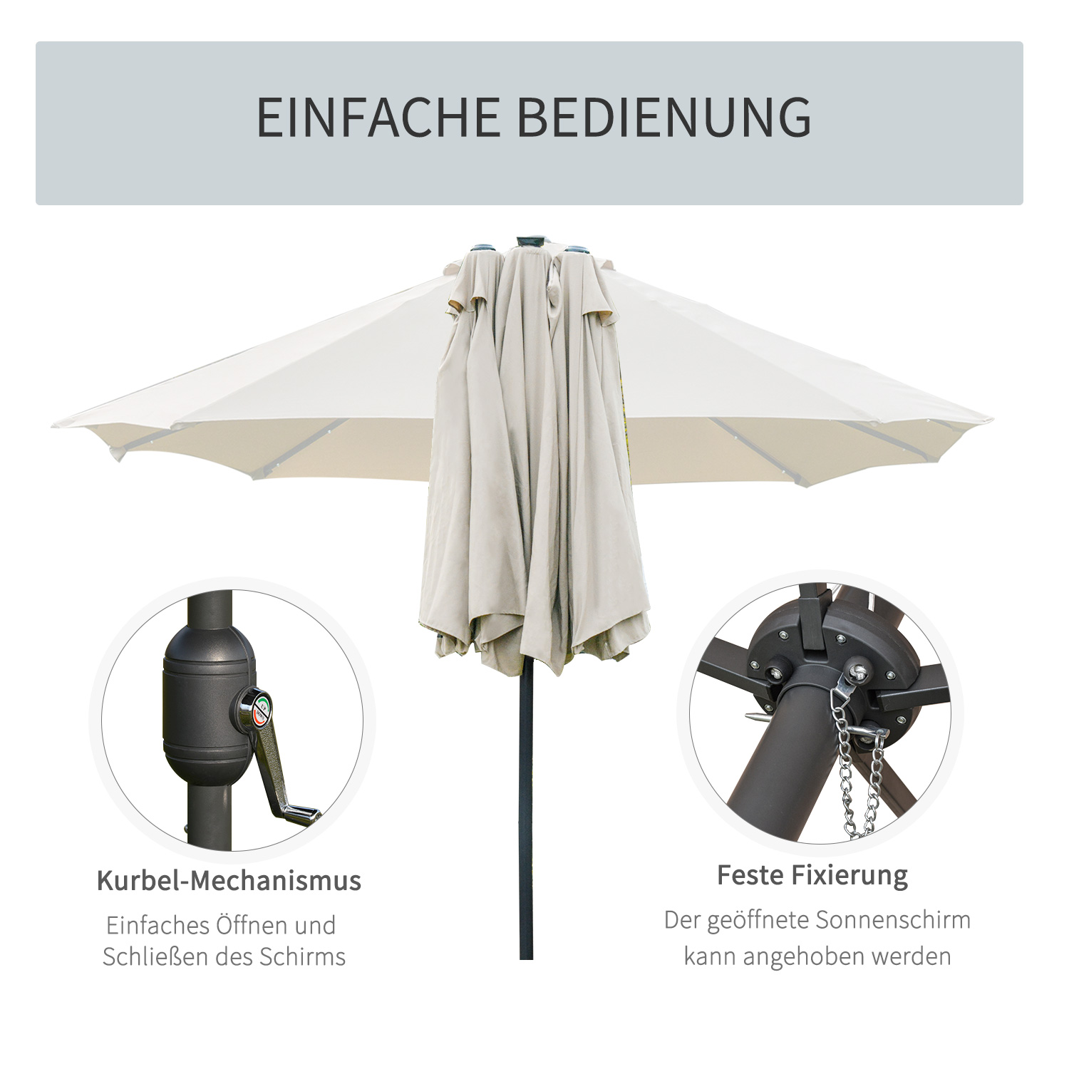 Lassen Sie Ihren Garten oder Terrasse mit diesem doppelten Sonnenschirm von Outsunny erstrahlen! Der geschmackvoll designte Sonnenschirm verfügt über 36 LED-Leuchten, die an den Streben angebracht sind, sodass Sie auch bei Dunkelheit genug Licht zum Lesen oder für andere Hobbys haben, Tagsüber schützt Sie der große Doppel-Gartenschirm vor direkter Sonneneinstrahlung, Wenn Sie Ihren Garten verschönern möchten, dann ist dieser Gartenschirm genau die richtige Wahl,