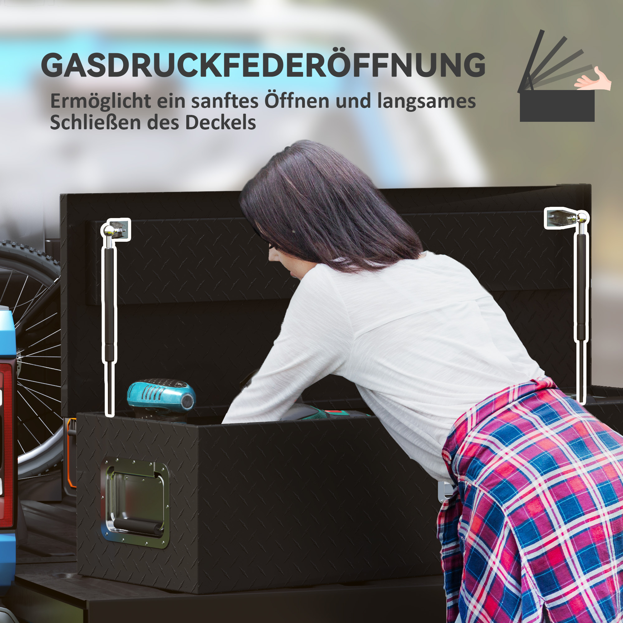 - Bequem zugänglich und sicher: Dank eines Gasdruckdämpfers öffnet und schließt sich der Deckel sanft und vermeidet so Verletzungen durch plötzliches Zuschlagen, Das robuste Schloss schützt vor Diebstahl und minimiert Stöße beim Fahren