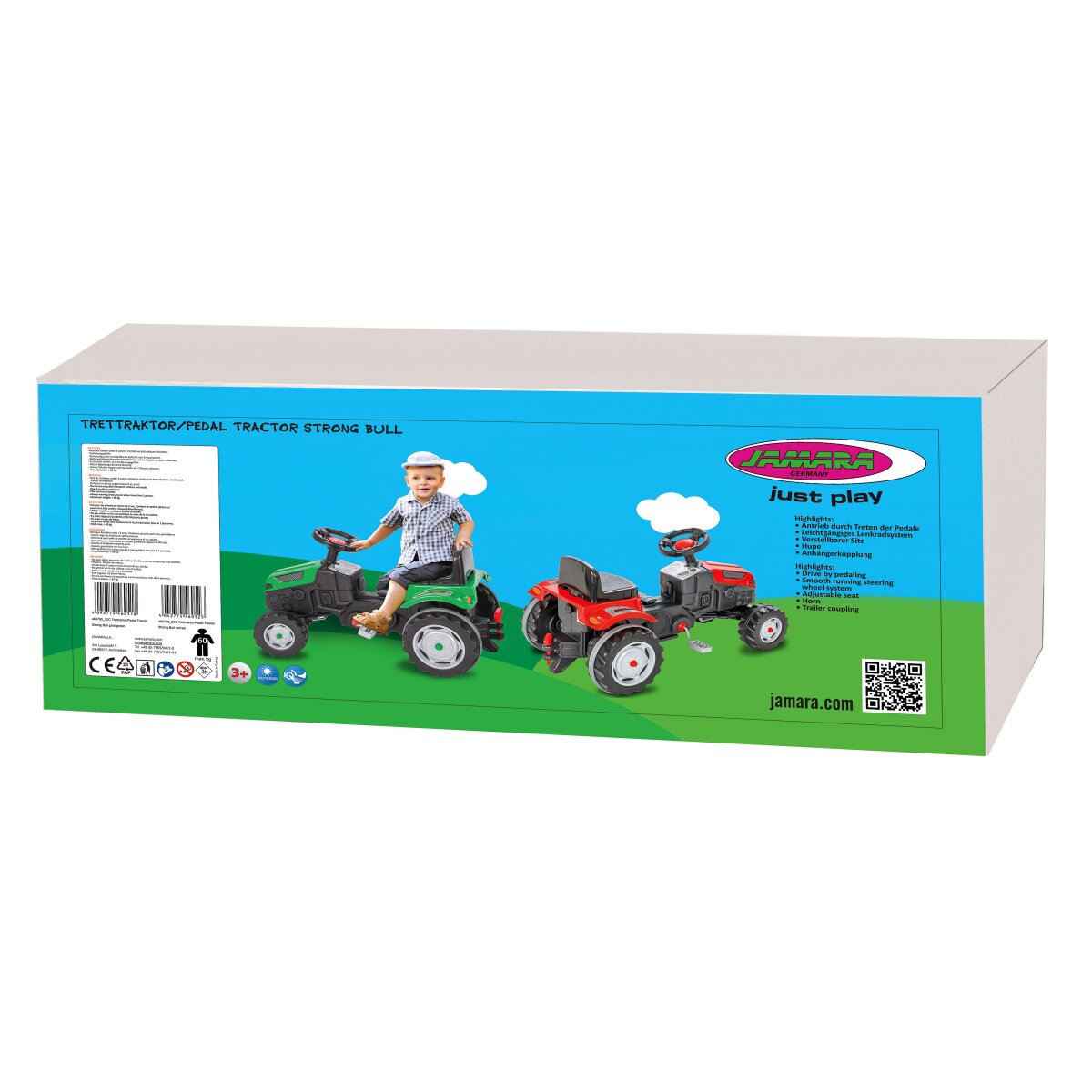 Die Trettraktoren von JAMARA erfreuen sich seit der Markteinführung großer Beliebtheit. Einfach aufsitzen und lostreten und schon kann die wilde Fahrt beginnen. Der Trettraktor Strong Bull in zwei kindgerechten Farben, hat ein leichtgängiges Lenksystem und einen verstellbaren Sitz und dann so über die Jahre mitwachsen und angepasst werden. An die praktische Anhängerkupplung am Heck können verschiedene Anbaugeräte angebracht werden z.B. der stabile Anhänger von JAMARA für den Strong Bull.