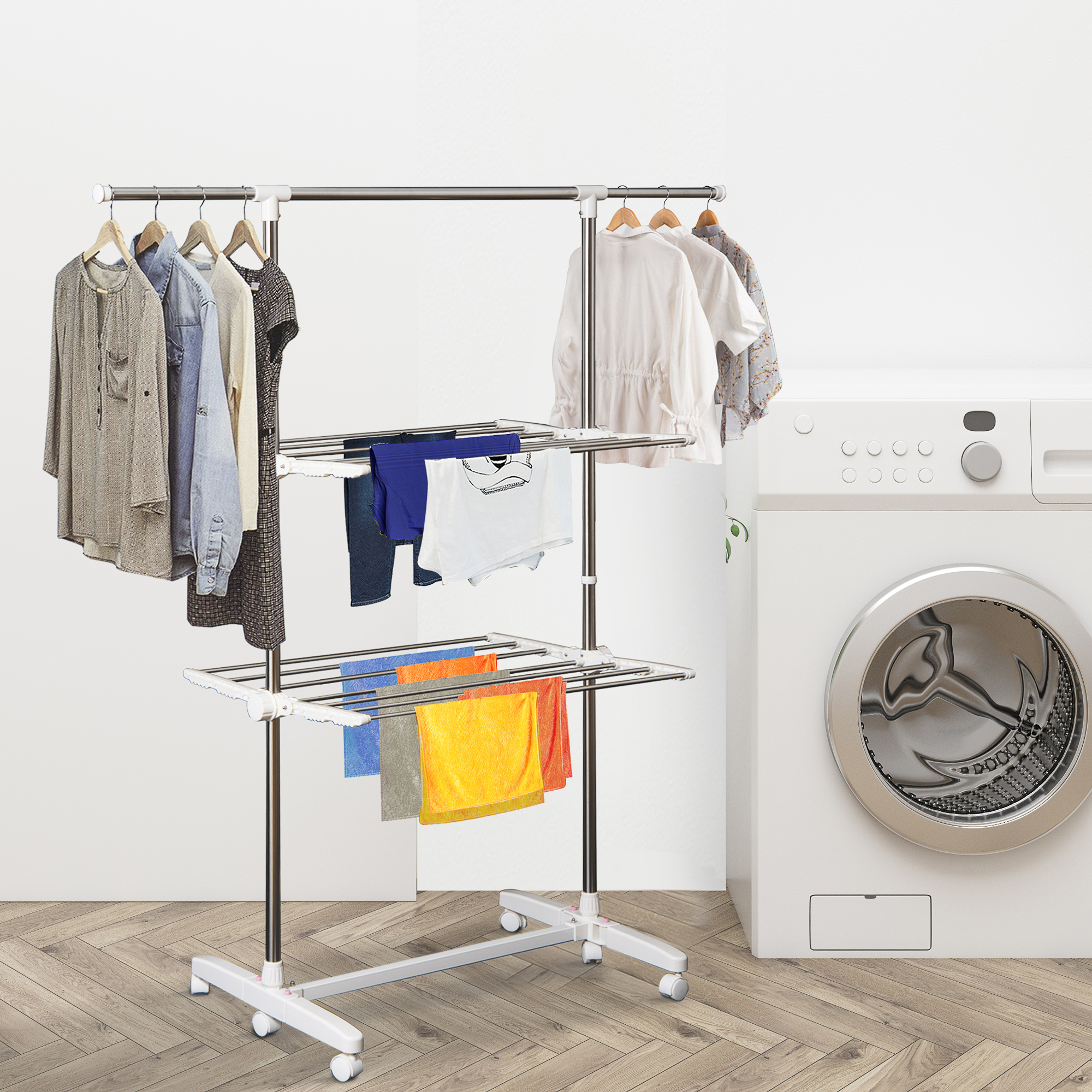 Dieser Wäscheständer im klassischen hellen Design verbindet hohe Qualität, Nützlichkeit und Platzersparnis ganz in einem, Mit sechs Fußrollen und Bremsen ist der Wäscheständer praktisch und mobil, somit kann er nicht nur im Innen- sondern auch im Außenbereich vielseitig eingesetzt werden, Er erfüllt viele Anforderungen des täglichen Gebrauchs und ist in jedem Haushalt vor allem für große Familien eine nützliche und erleichternde Ergänzung,