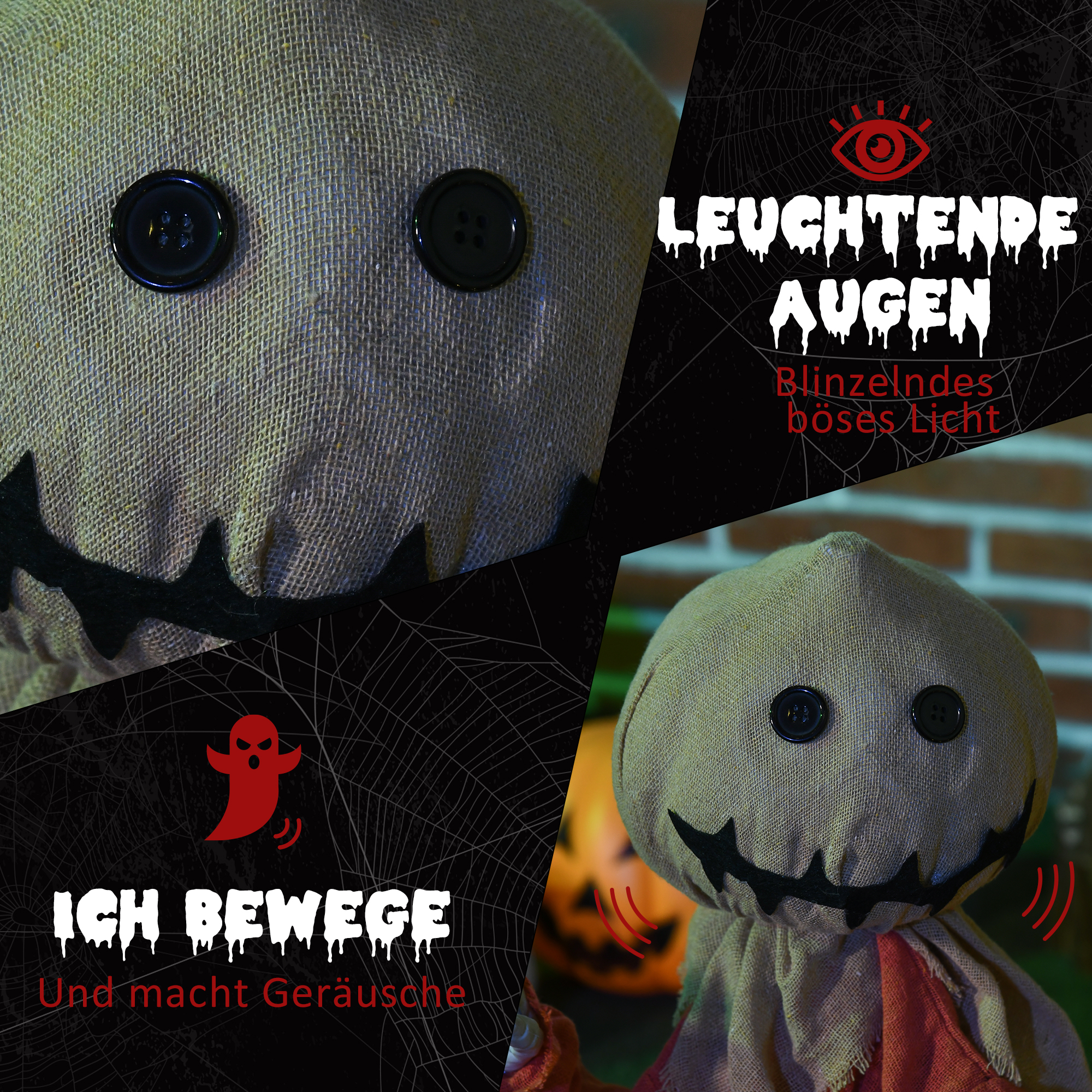 - - Geräusch- und Berührungsaktiviert: beginnt sich zu bewegen, macht Geräusche und die Augen leuchten auf, Erschreckt die Süßes-oder-Saures-Besucher