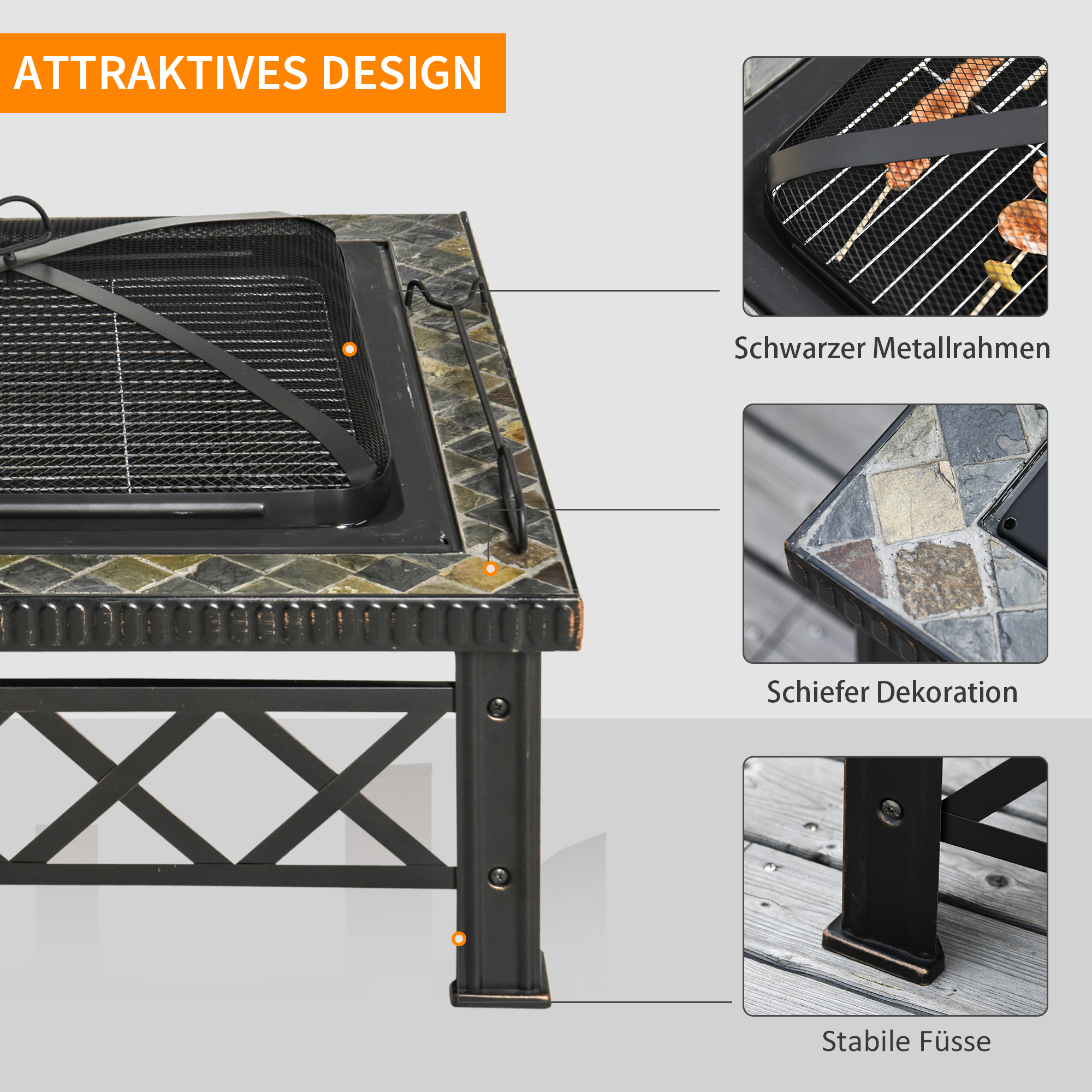 - FEUERSCHALE FÜR DEN AUSSENBEREICH: Die quadratische Feuerstelle hat einen schwarzen Metallrahmen und stilvolle, dekorative Schieferplatten am Rand, Es ist ein besonderer Blickpunkt für jeden Garten, Terrasse oder Deck, ideal für die Schaffung einer fesselnden und gemütlichen Atmosphäre an kühlen Abenden