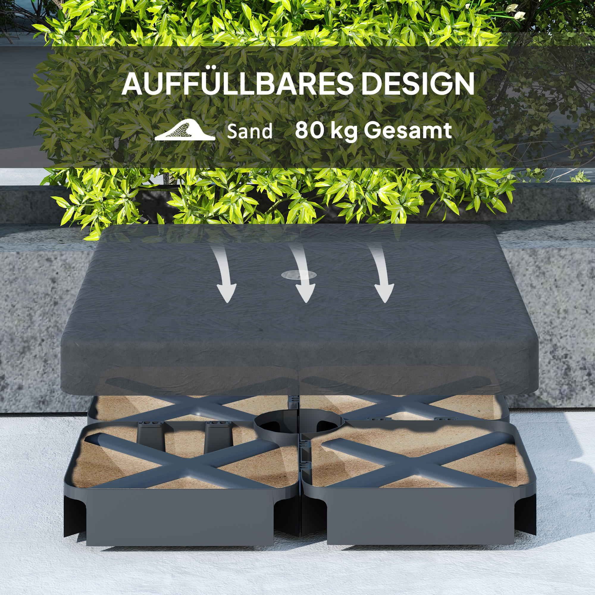 Verbessern Sie Ihre Outdoor-Einrichtung mit unseren Premium-Beschwerungsplatten für Sonnenschirm, Aus modifiziertem Kunststoff-Material gefertigt, garantieren sie erhöhte Festigkeit und Stoßfestigkeit, Die wetterfeste Polyesterhülle des befüllbaren Schirmständers ist wasserdicht und UV-beständig, was die Langlebigkeit sichert, Dank der Befüllöffnung der Platten für Ampelschirm lassen sich bis zu 80 kg Sand einfüllen, um optimale Stabilität zu gewährleisten, Das ganze Jahr über einsatzbereit!
