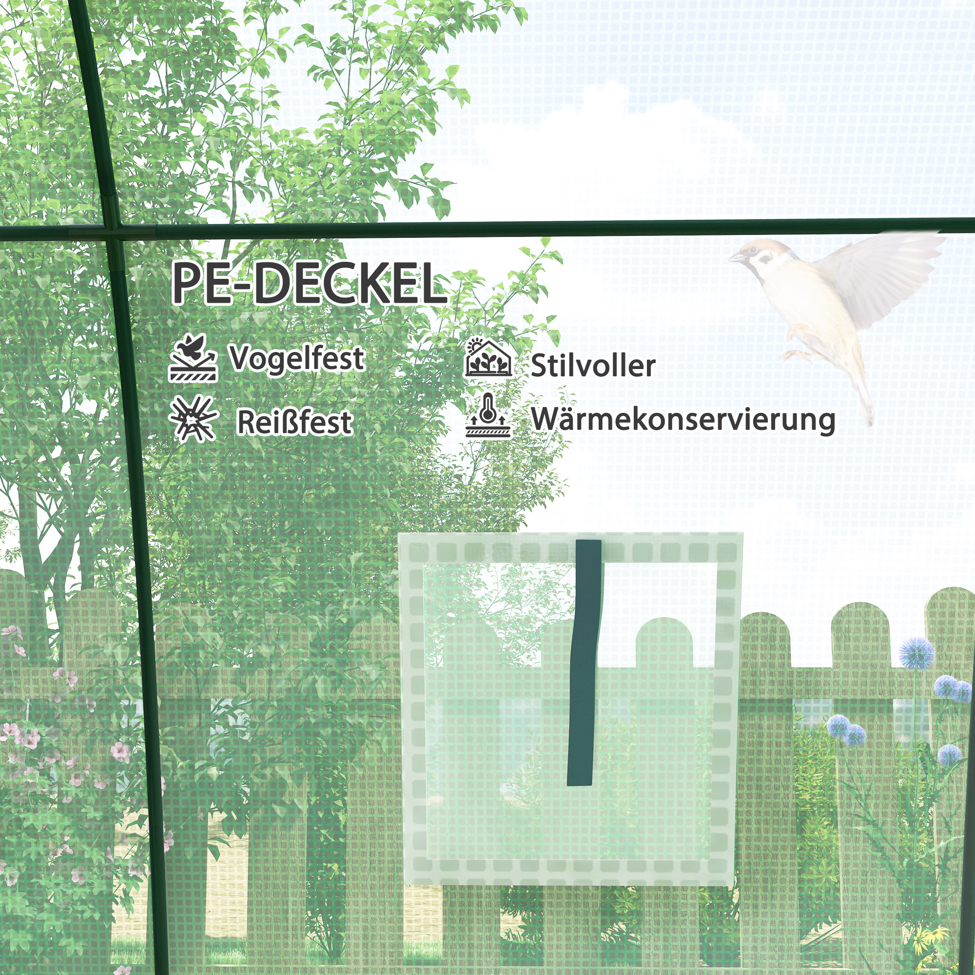 • Verstärkte Kunststoff-Abdeckung: Die Abdeckung des Foliengewächshauses schützt die Pflanzen vor UV-Strahlung und lässt gleichzeitig 85% des wertvollen Sonnenlichts durch, Das verstärkte Gitter in der Mitte und der gesäumte Rand helfen, Risse zu verhindern