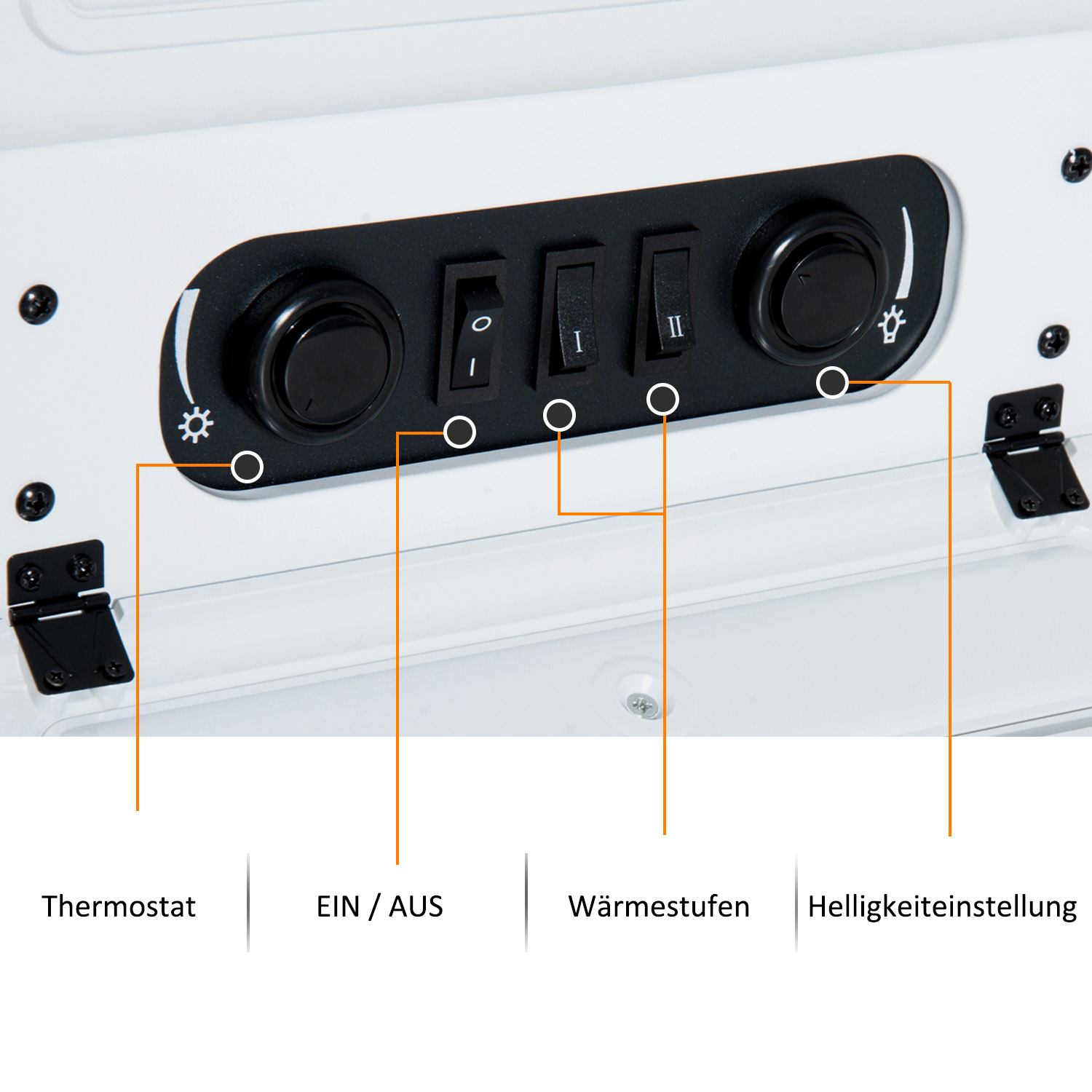 - Indivduell Einstellbar: Die Lichtintensität, sowie die Heizleistung (950 W oder 1850 W) kann je nach Bedarf eingestellt werden,