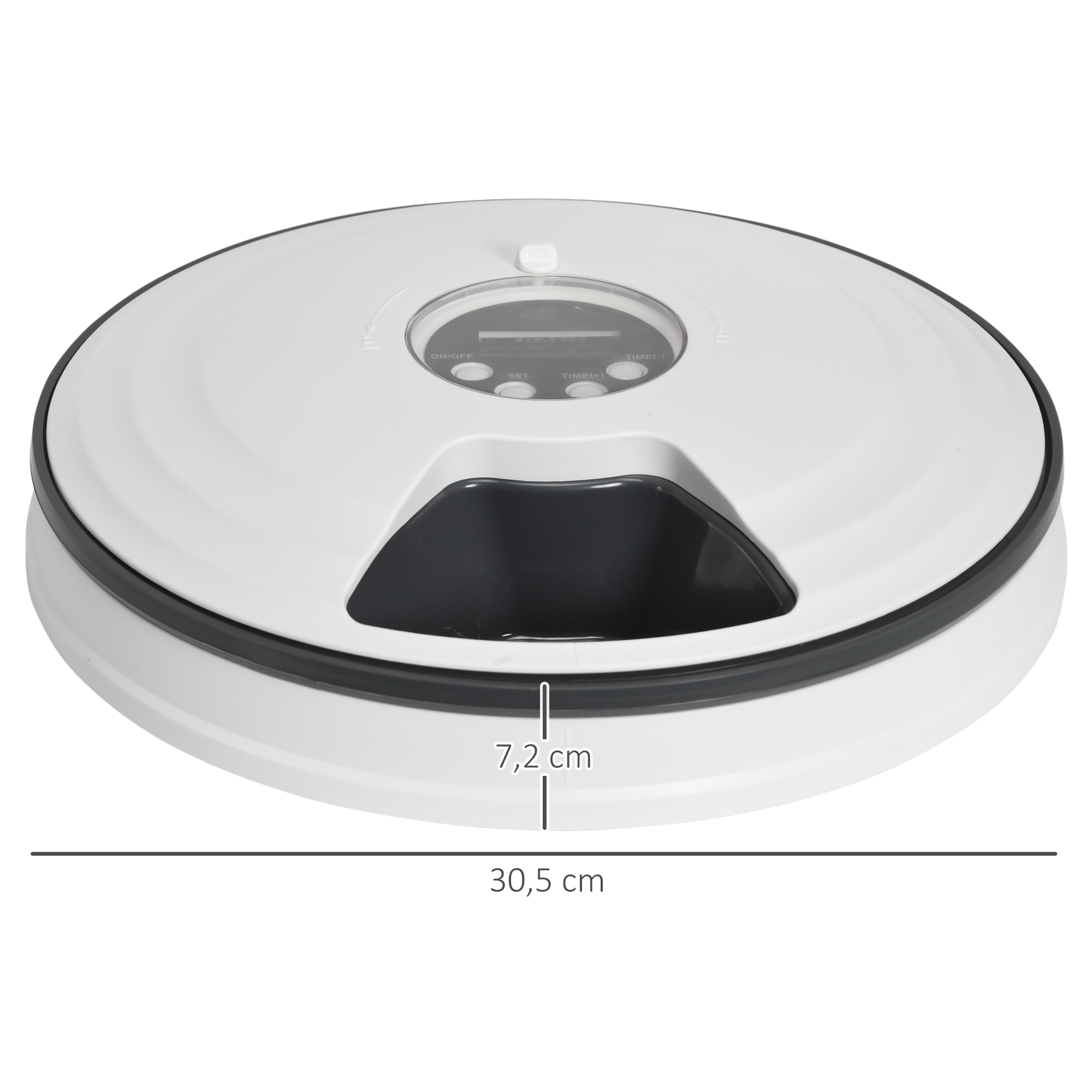 Dieser automatische Futterautomat von PawHut kann Ihnen bei der Fütterung ihrer Haustiere helfen, Er verfügt über 6 Spenderschalen, jede mit einem Fassungsvermögen von 128 ml, geeignet für Katzen und kleine Hunde, Sie können ihn entsprechend der Essenszeit Ihres Tieres einstellen, Er kann bis zu 4 Mahlzeiten pro Tag bereitstellen, Wenn die voreingestellte Zeit gekommen ist, wird Musik abgespielt, um den Hund an das Fressen zu erinnern,