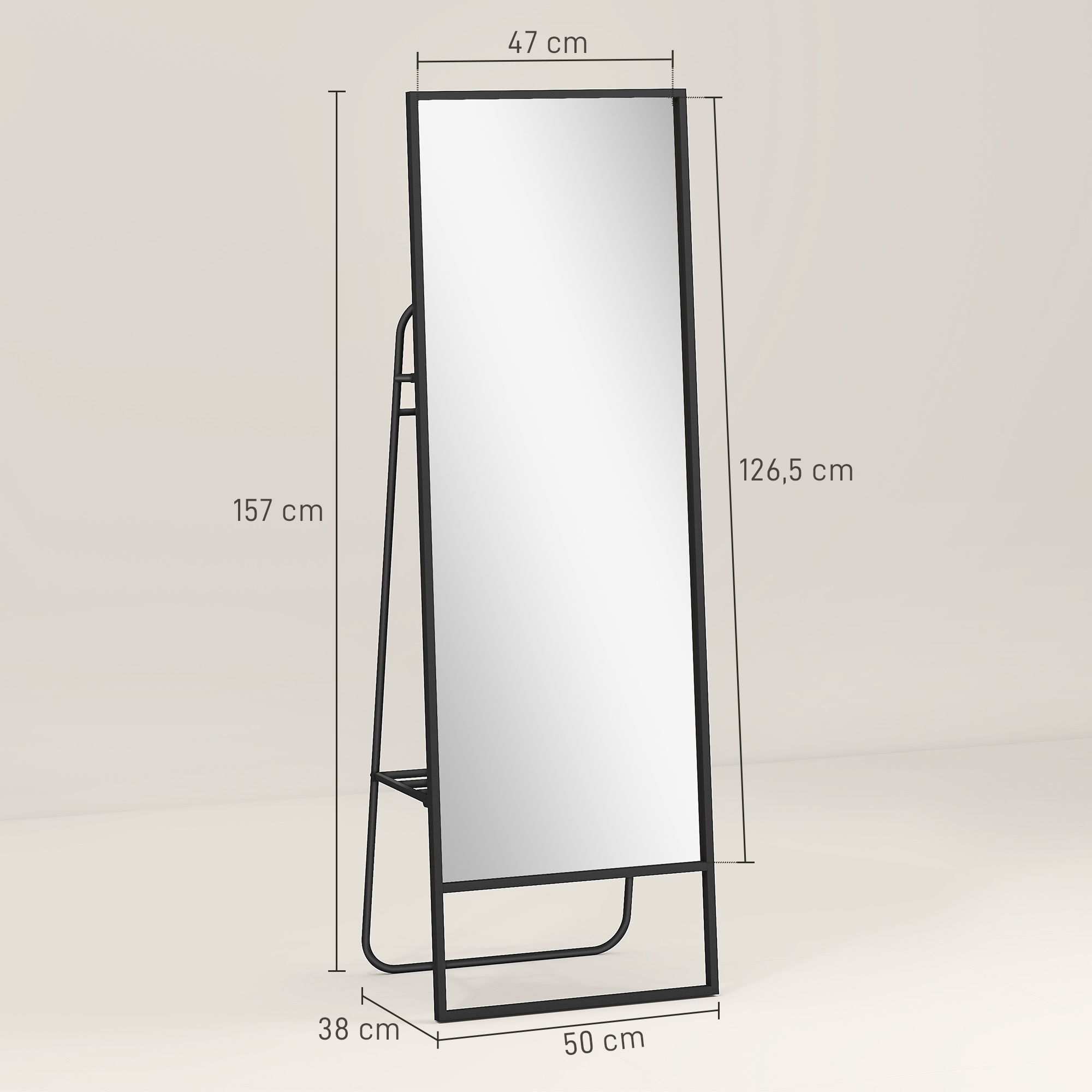Ganzkörperspiegel, industrielles Design, hinteres Regal, 2 Haken, Metallrahmen, für Schlafzimmer, 157 x 50 cm, Schwarz