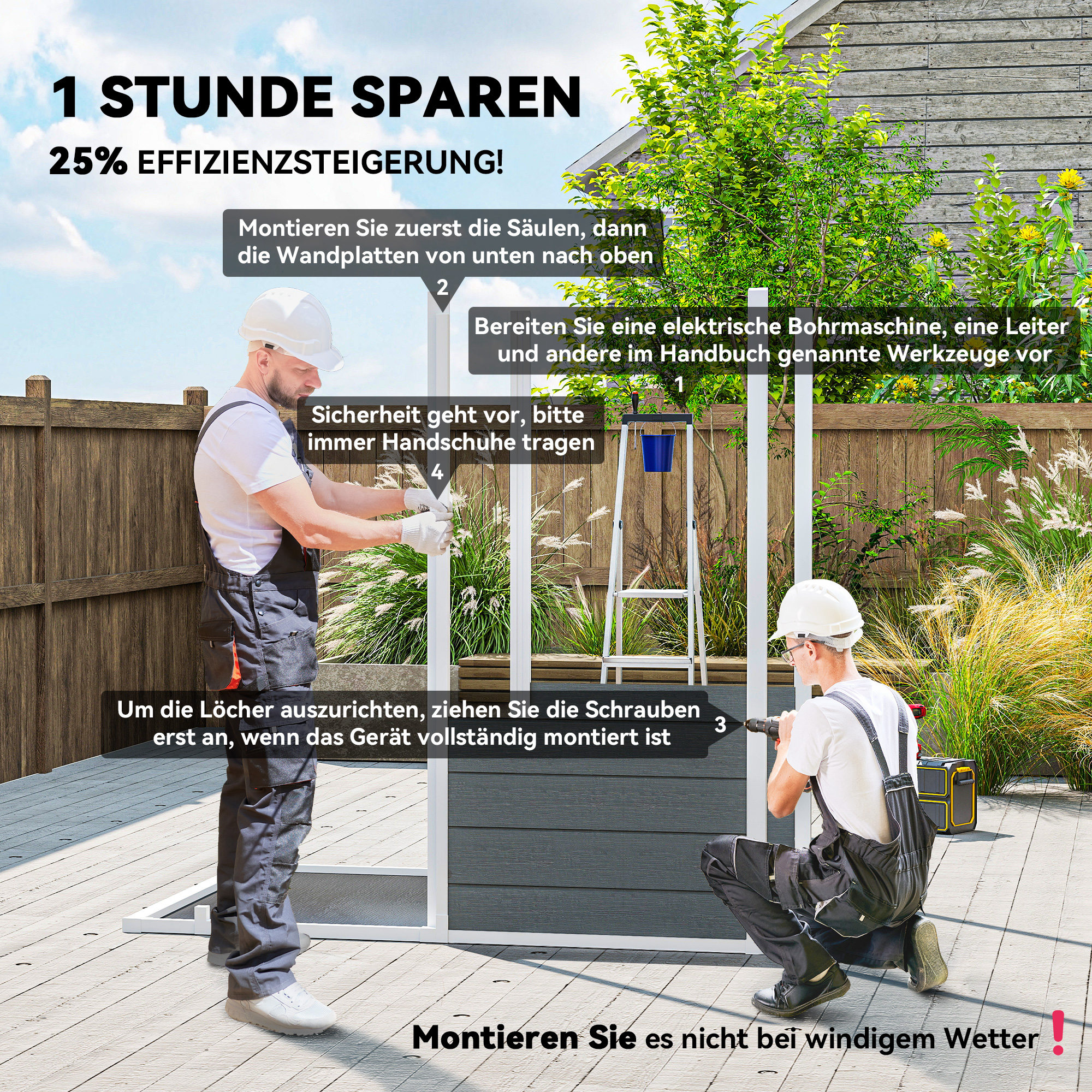 - Installationsdetails zum Gartenschuppen: Die Bauklotz-ähnliche Installationsweise vereinfacht den Aufbau erheblich, Der Aufbau benötigt 2-3 Personen und ca, 3 Stunden, Vermeiden Sie die Montage bei starkem Wind und tragen Sie stets die mitgelieferten Handschuhe