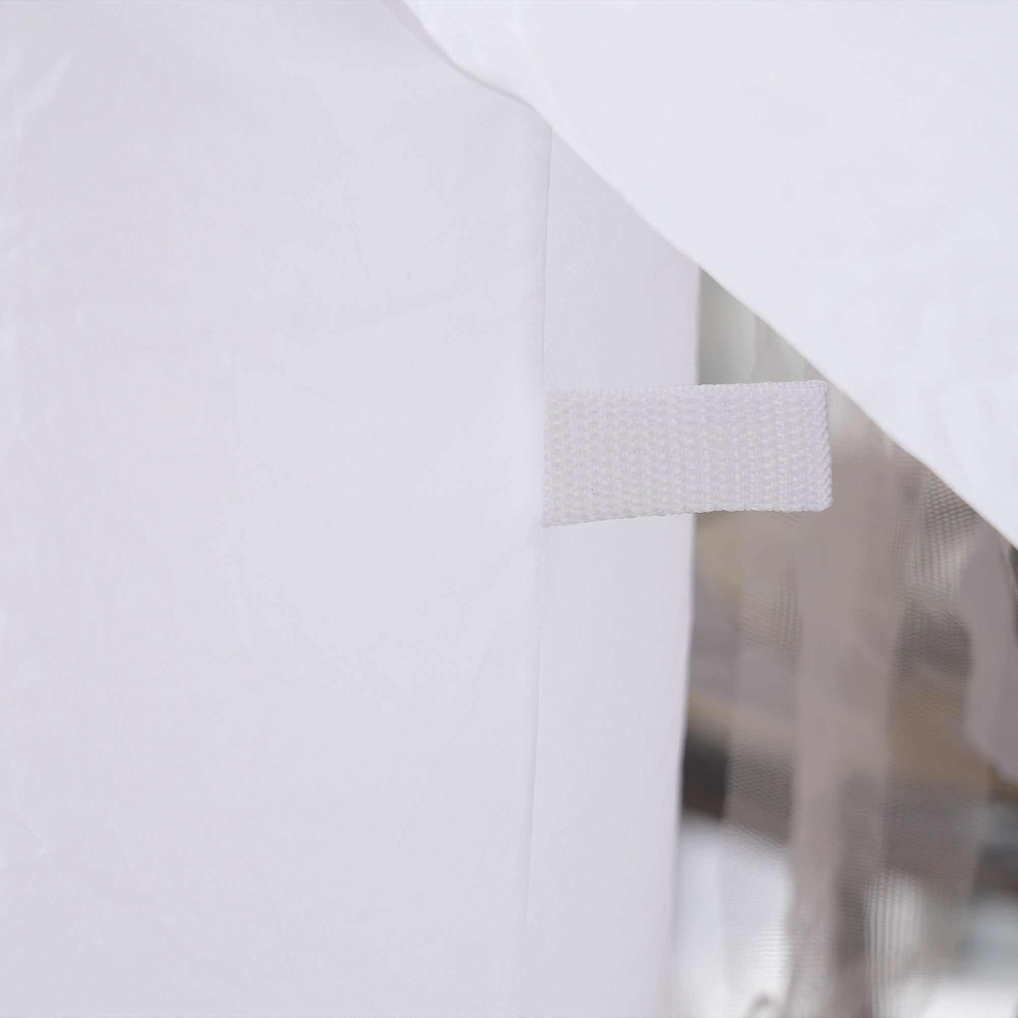 - - Fünf Heringe, zwei Spannleinen und drei Sandsäcke zur Befestigung am Boden