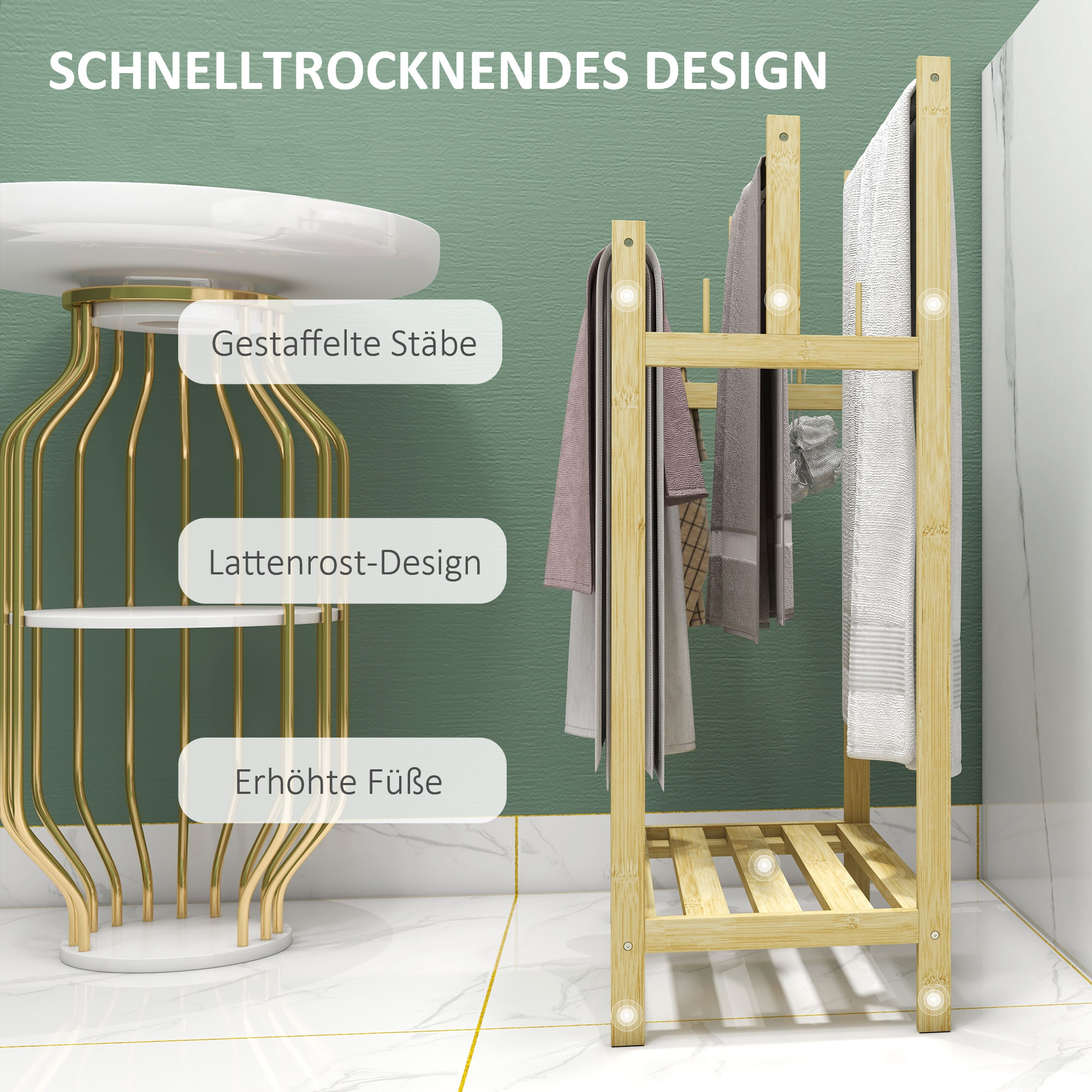 Verleihen Sie Ihrem Zuhause einen Hauch von Eleganz mit dem stilvollen Handtuchhalter von HOMCOM aus Bambus, Dieser freistehende Handtuchständer mit seinem 3-Stangen-Design in unterschiedlichen Höhen und einem Abstand von 12 cm ermöglicht es Ihnen, Ihre Handtücher ordentlich zu organisieren, Ob im Waschraum für Bettlaken, im Wohnzimmer für Decken oder im Schlafzimmer für Schals - dieser leichte Standhandtuchhalter hilft Ihnen, Ordnung zu schaffen und hygienische Harmonie zu wahren,