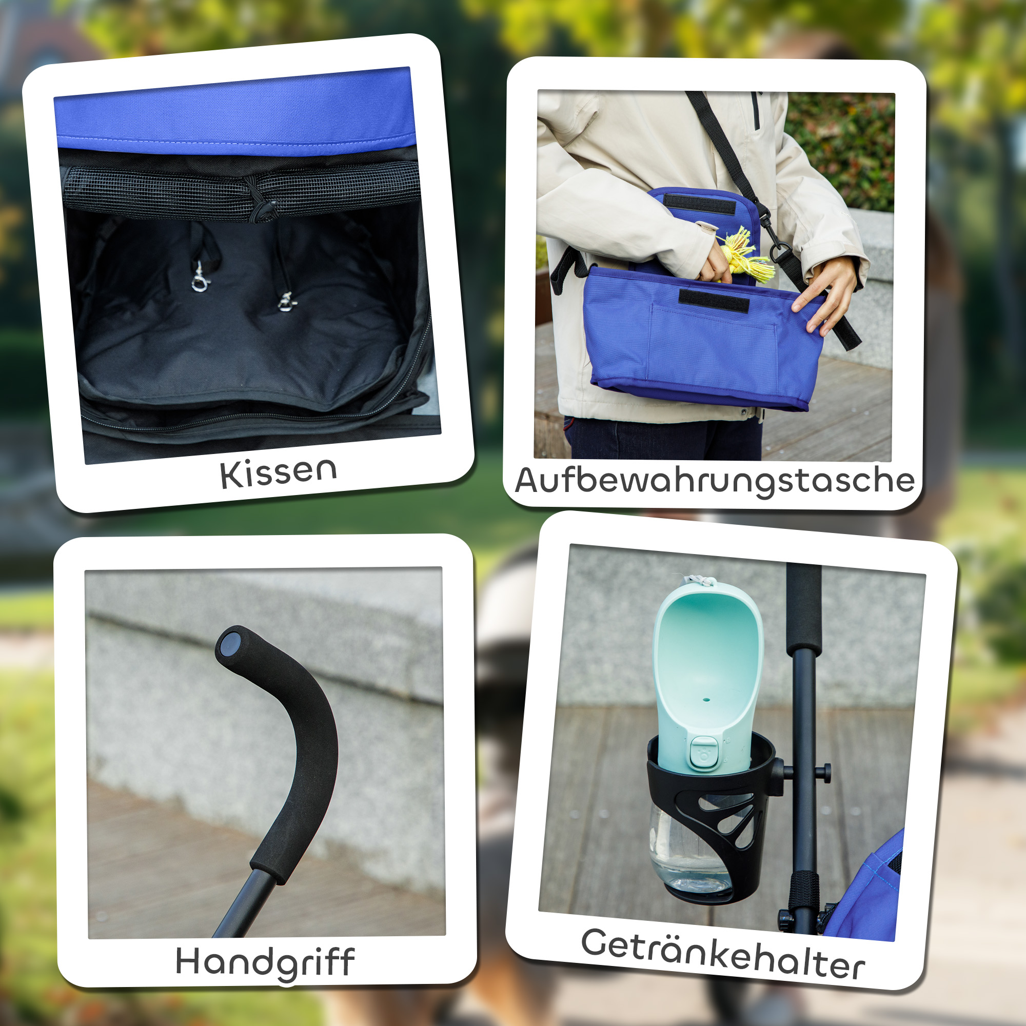 - Mehr Bequemlichkeit für Sie: Ausgestattet mit einem Becherhalter für Ihren Kaffee oder Ihr Wasser sowie einer Aufbewahrungstasche für Spielzeug, Snacks oder sonstiges Zubehör, das Ihr Haustier benötigt, Ideal für entspannte Spaziergänge, Erledigungen oder den Besuch beim Tierarzt,