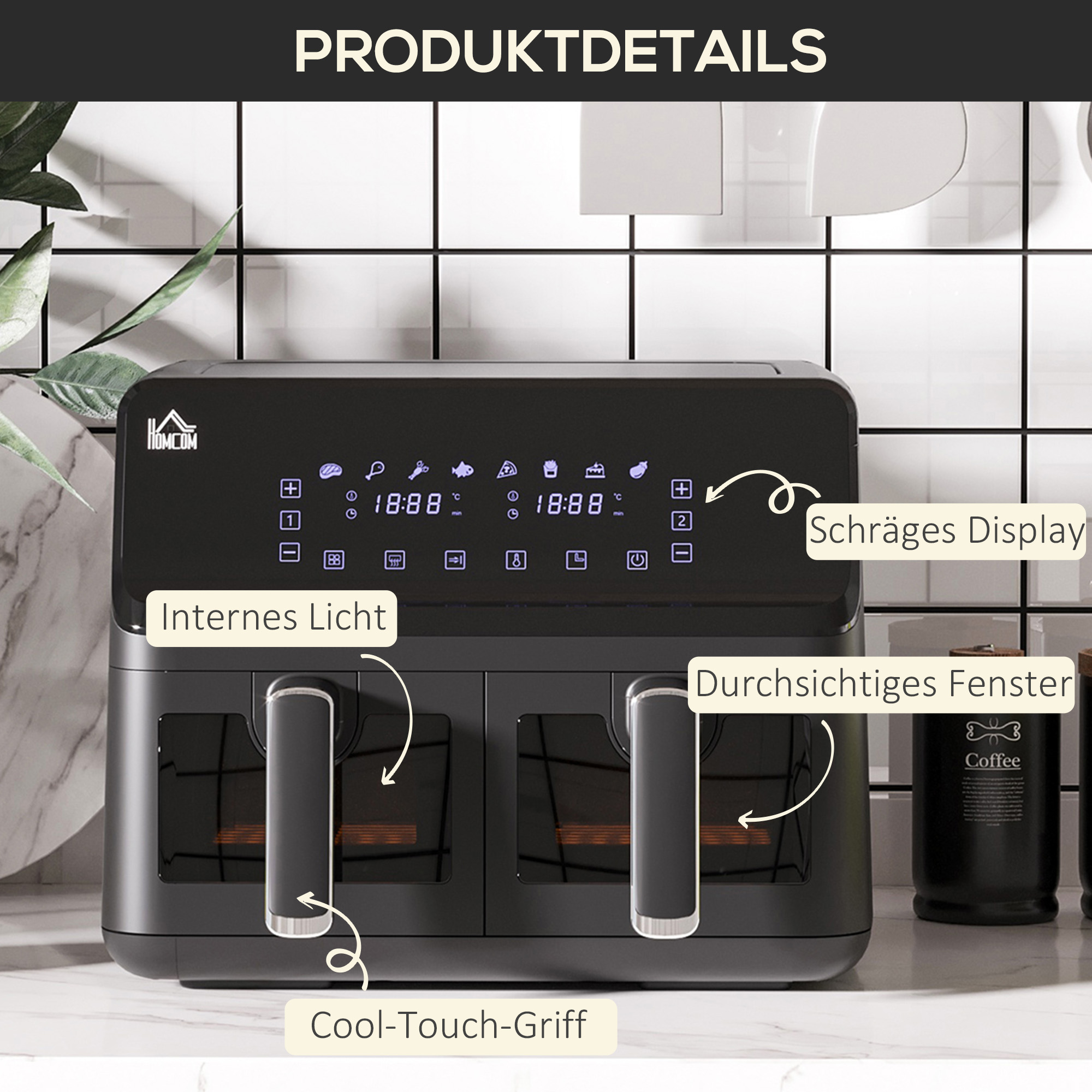 Zaubern Sie schnelle, knusprige und köstliche Gerichte mit dieser innovativen Heißluftfritteuse von HOMCOM! Sie arbeitet schneller als ein herkömmlicher Ofen und ermöglicht die Zubereitung nahezu aller Lebensmittel, Passen Sie die Temperatur der Heißluftfritteuse von 80 bis 200 ? an und nutzen Sie den praktischen 60-Minuten-Timer, Dank der zwei separaten Körbe können Sie unterschiedliche Gerichte gleichzeitig bei verschiedenen Temperaturen zubereiten,