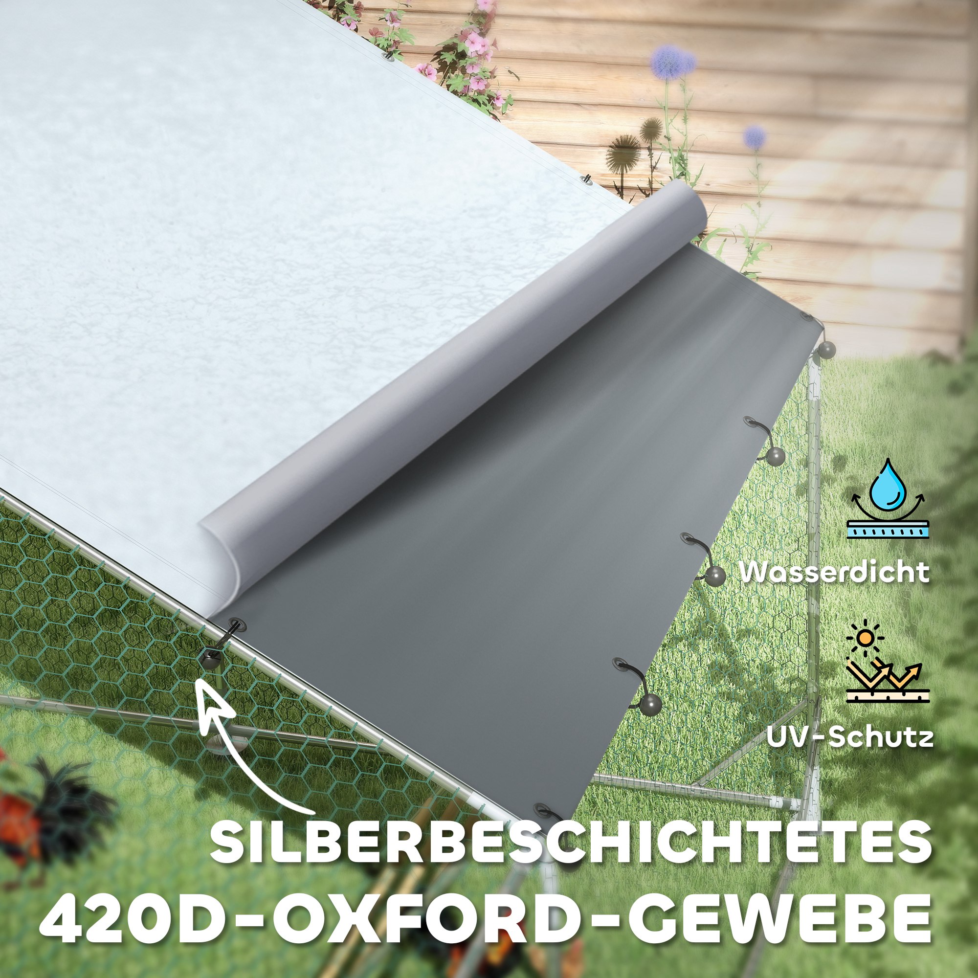 - - Verzinkter Stahl und kunststoffbeschichtetes Netz des Hühnergeheges gewährleisten Langlebigkeit