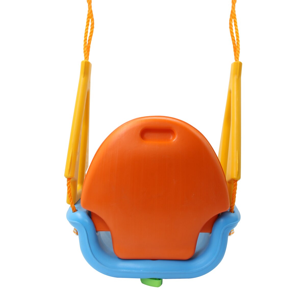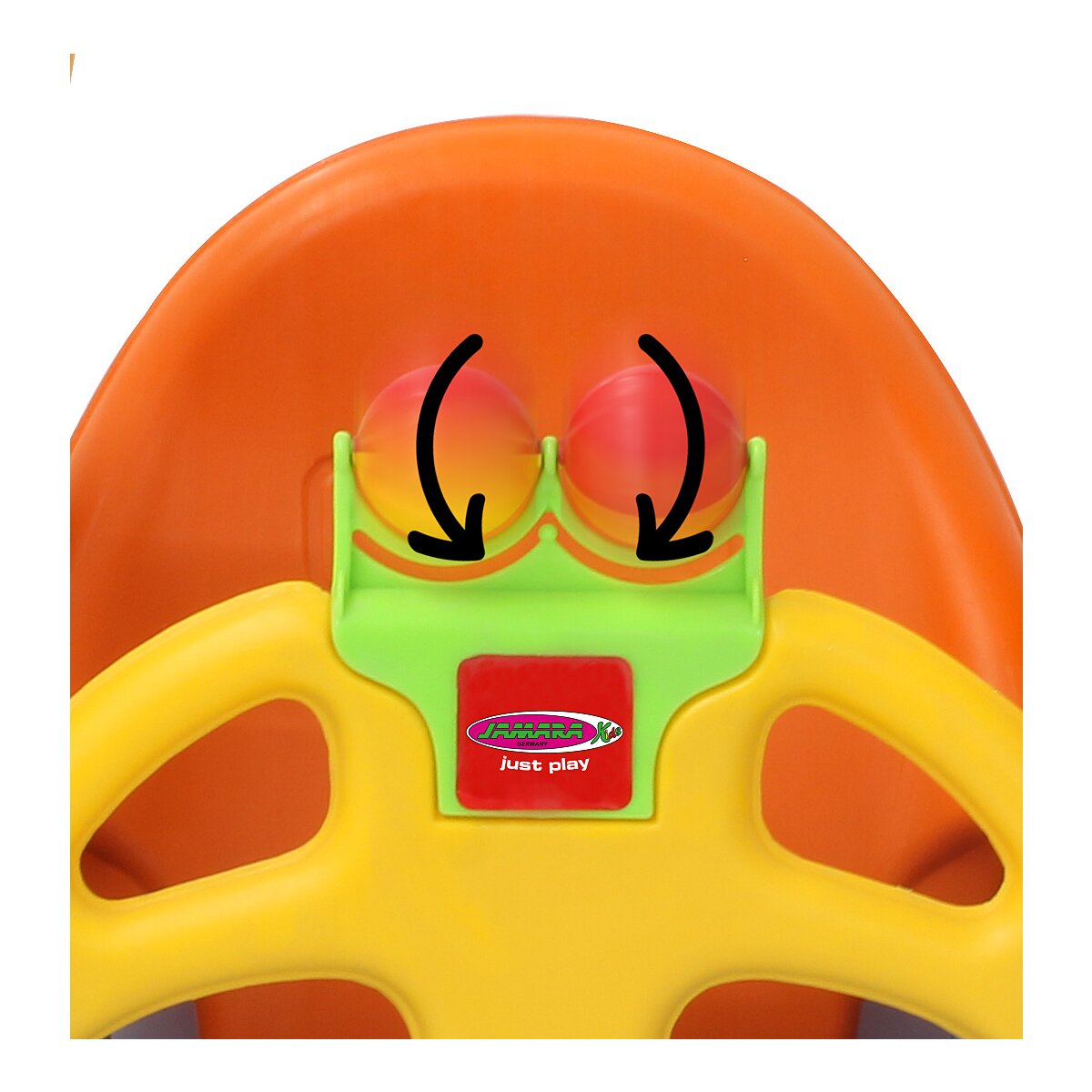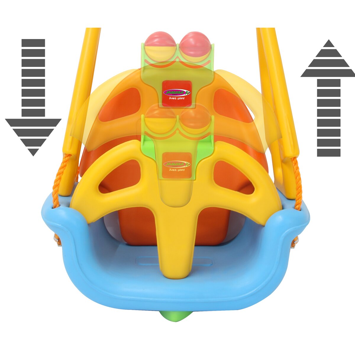Die Kinderschaukel – Grow with me 3in1 ist von JAMARA die erste Babyschaukel die mit Ihrem Kind mitwächst. Für die Kleinsten mit Rückenlehne, Frontbügel und lustigen Kugeln zum Drehen, die ein Rasselgeräusch machen. Der Frontbügel mit Beintrenner und die großen seitlichen Haltegriffe dienen dem sicheren Halt und verhindern das Durchrutschen. Ohne den Frontbügel verwandelt sich die Grow with me 3in1 Schaukel für die etwas größeren Kinder, die schon selbstständig sitzen können, in einen komfortablen Sitz und ganz ohne Rückenlehne wird aus der Sitzschaukel eine Brettschaukel. So können sich die Kinder mit Ihren Eltern langsam an die Herausforderung herantasten und die Schaukel nach den individuellen Bedürfnissen und Fortschritten in der Entwicklung verändern. Der Umbau der einzelnen Komponenten ist für Erwachsene mit wenigen Handgriffen ohne Werkzeug leicht machbar. Die robuste Schaukel ist aus hochwertigem, wetterbeständigem Kunststoff gefertigt.