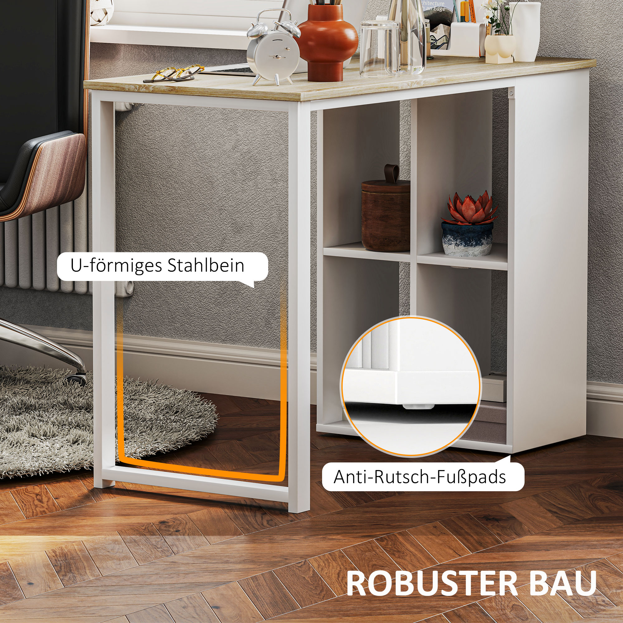Beleben Sie Ihren Arbeitsplatz mit dem HOMCOM Computertisch, der eine moderne Eichenoberfläche mit einem klaren weißen Finish vereint, Der kompakte Schreibtisch mit den Maßen 100 x 54 cm passt ideal in jedes Homeoffice, Büro oder ein beliebiges Zimmer, Mit vier offenen Fächern für übersichtliches Organisieren und einem hochwertigen Spanplatten- und Stahlrahmen sowie Anti-Rutsch-Fußpads für eine stabile Nutzung,