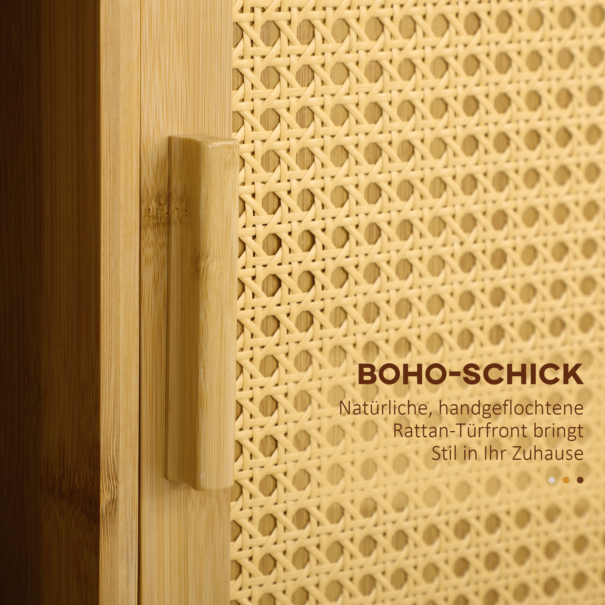 Maximieren Sie den Platz in Ihrer Küche und schaffen Sie Ordnung mit diesem HOMCOM Küchenwagen aus Bambus, Mit seiner Rattantür und den platzsparenden Aufbewahrungsmöglichkeiten, einem Schrank, zwei Ablagefächern und zwei Schubladen ist er ein vielseitiges und stilvolles Küchenmöbel, Diese kleine Kücheninsel lässt sich auf feststellbaren Rollen leicht durch den Raum bewegen und bringt den Komfort genau dorthin, wo er am meisten gebraucht wird, Werten Sie Ihre Küche noch heute mit diesem Aufbewahrungswagen auf,