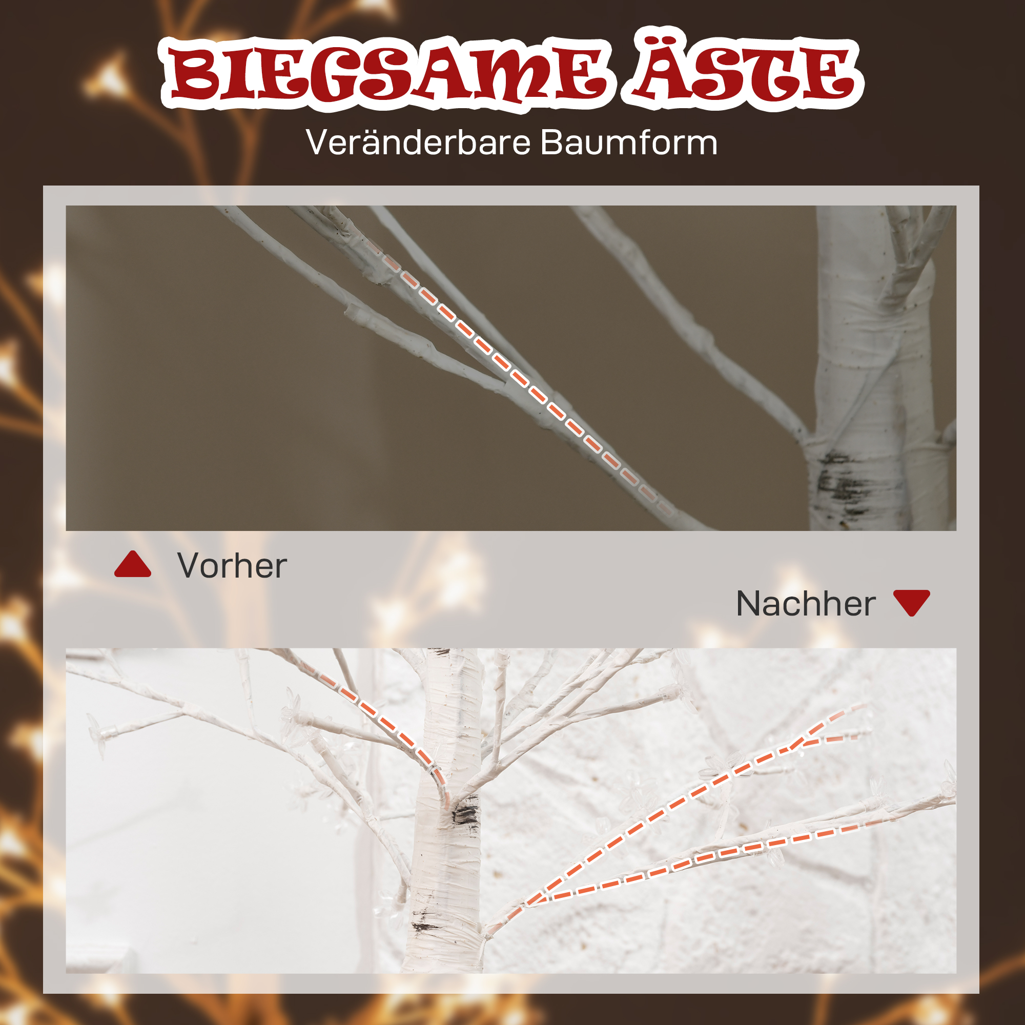 - Flexibles Design: Die biegsamen Äste können ohne zu brechen in jede beliebige Form gebogen werden. Zugleich sind sie besonders stabil und können mit reichlich Baumschmuck behangen werden.