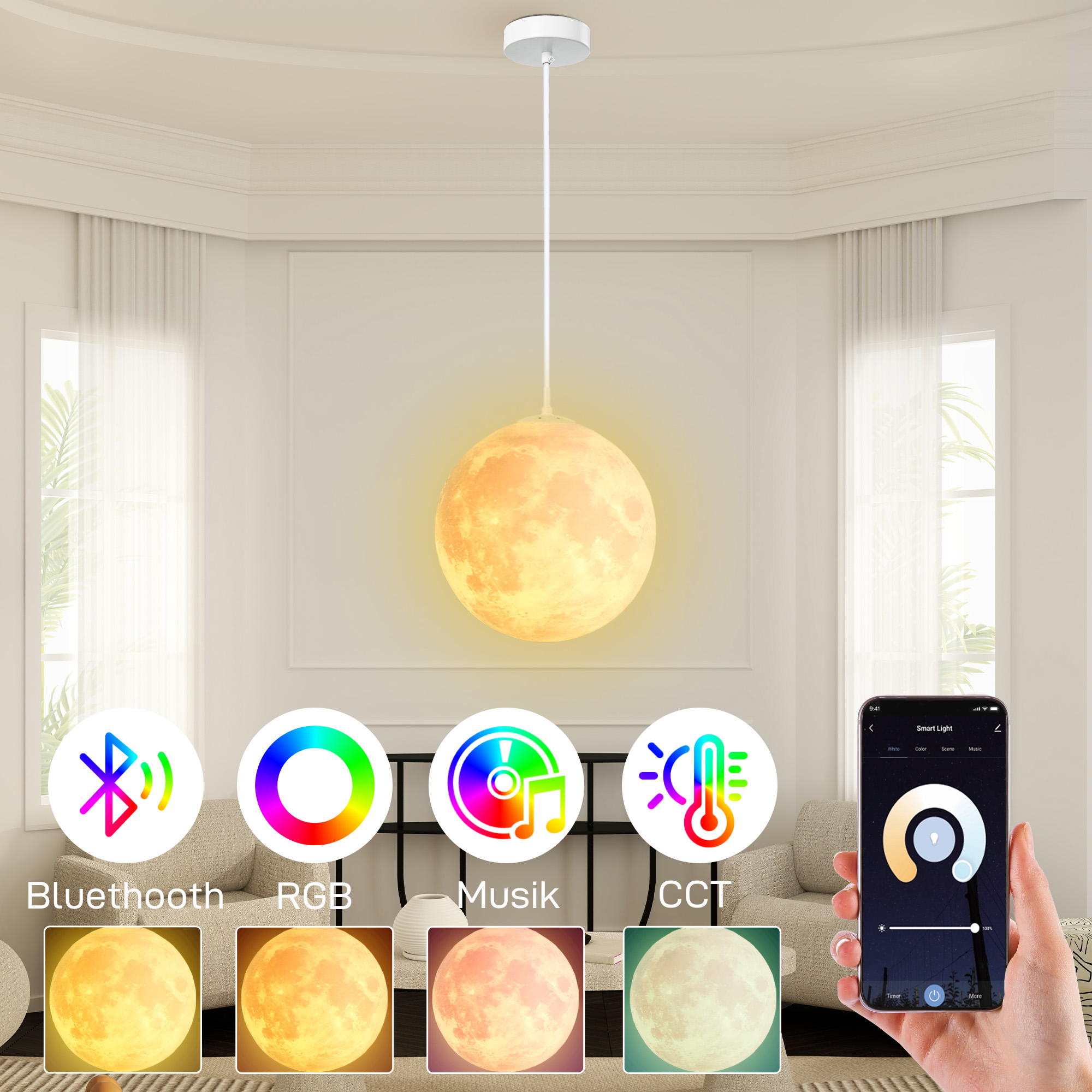 Erleben Sie den magischen Schein der HOMCOM Mondlampe, hergestellt mit hochmoderner 3D-Drucktechnologie für einen himmlischen Effekt, Mit dem verstellbaren Kabel und einem Drehknopf der Hängeleuchte setzen Sie kinderleicht die perfekte Beleuchtung für jede Laune, Steuern Sie über die Tuya APP von sanfter Beleuchtung bis zu dynamischen, musikgesteuerten Lichtspielen und gestalten Sie Ihr Ambiente nach Wunsch, Passen Sie mit CCT und RGB die Beleuchtung für jede Gelegenheit individuell an,