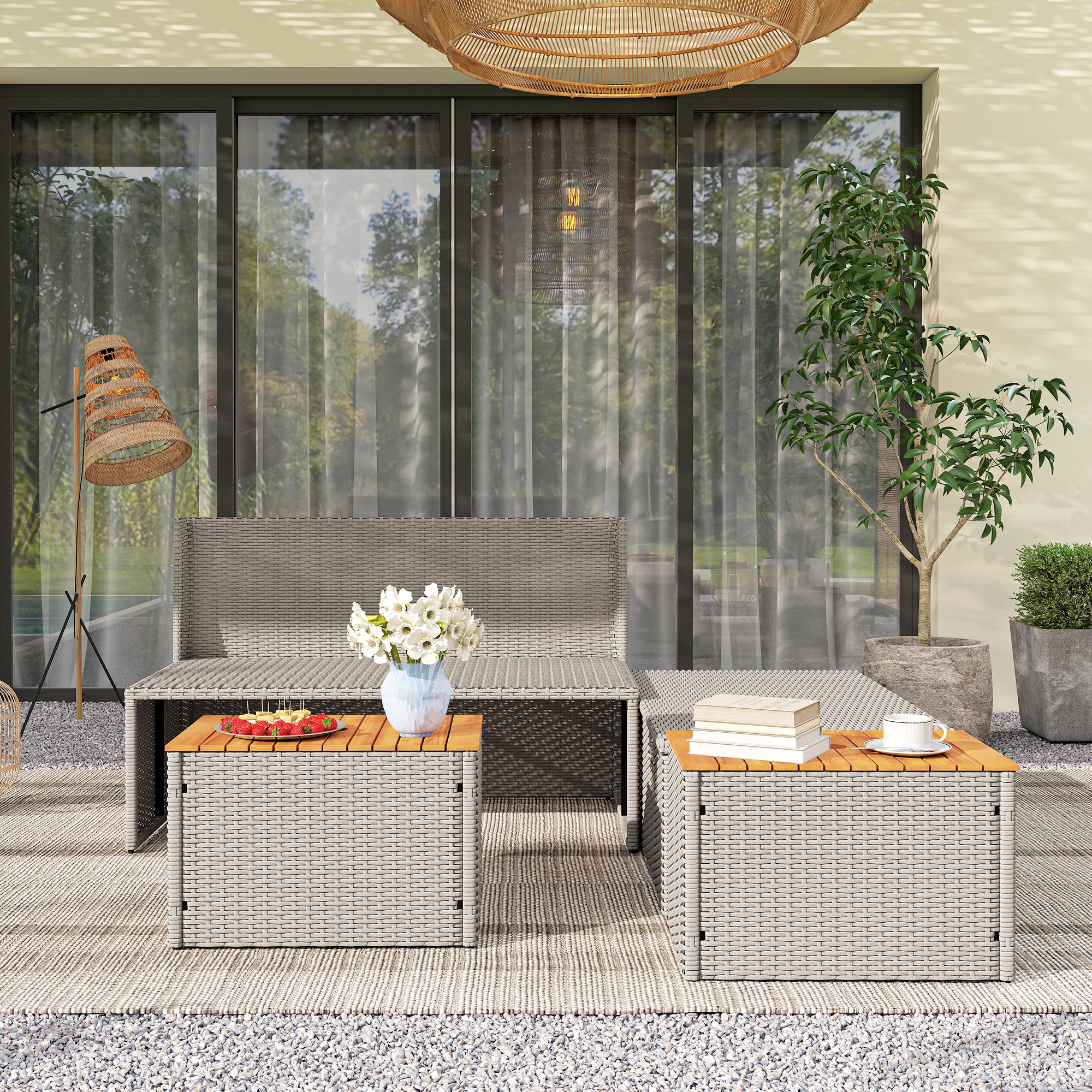 - - Versteckter Stauraum in den Beistelltischen und dem Fußhocker der Balkonliege maximiert den Platz